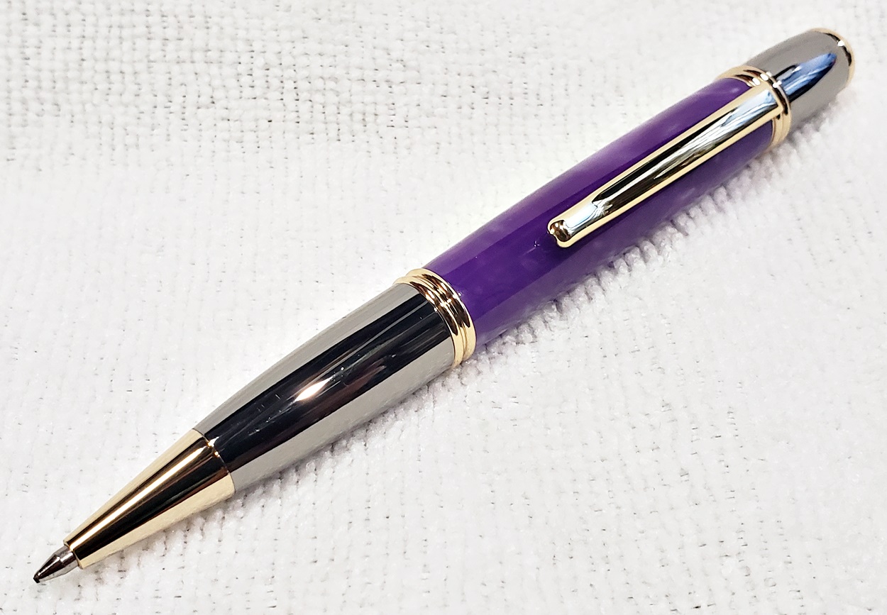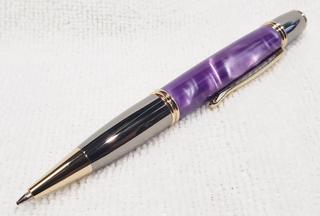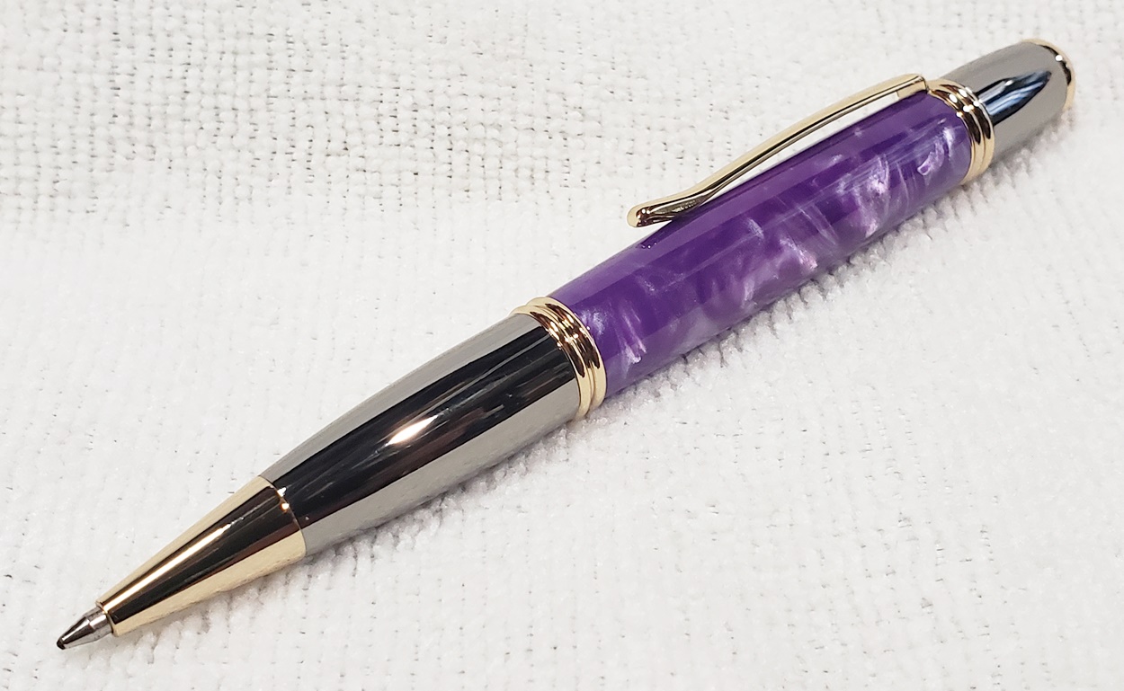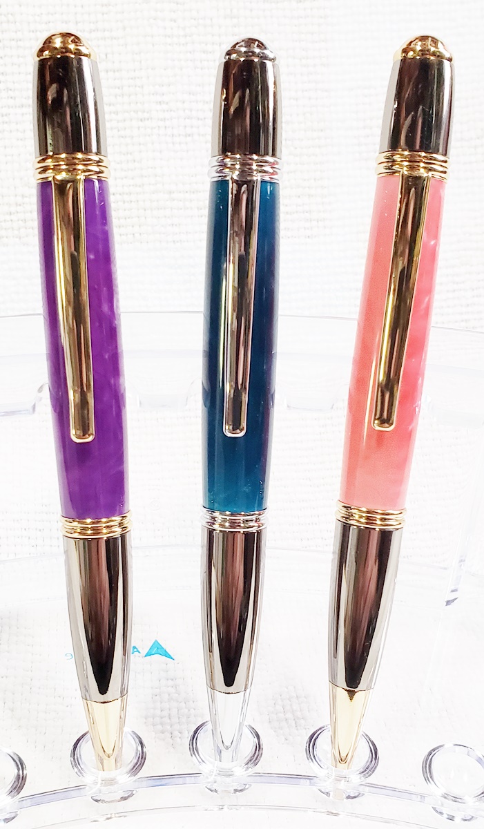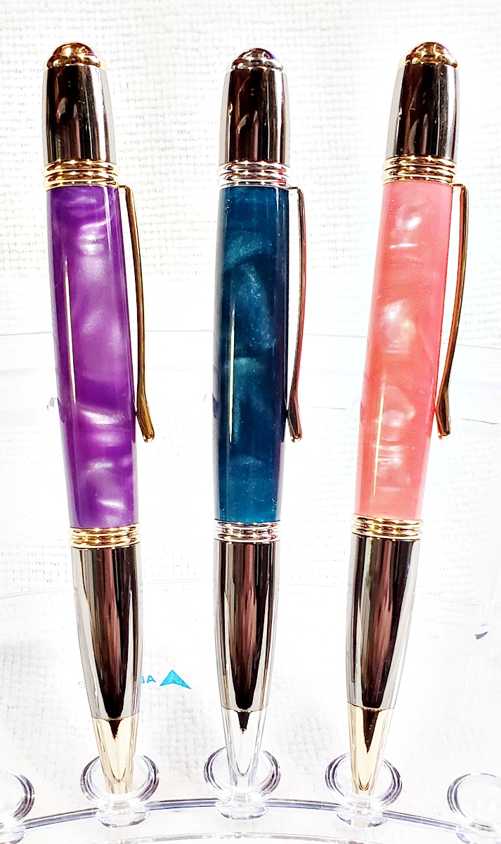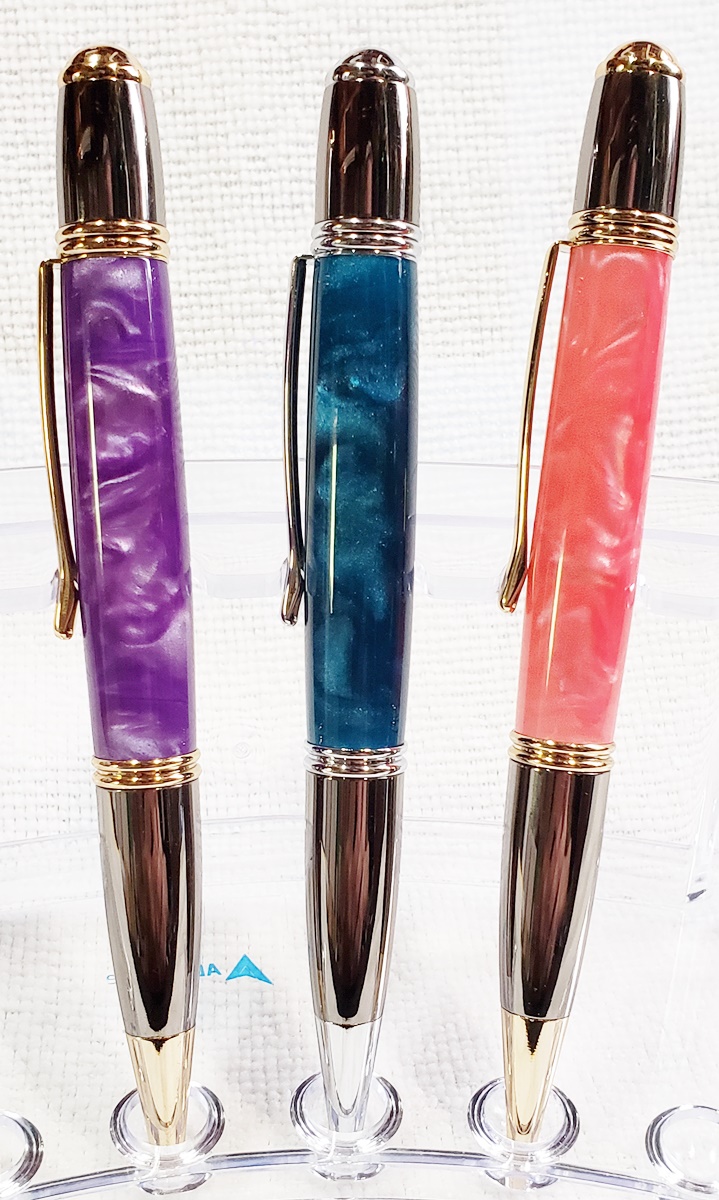 I made these for a friend's three kids, two girls and a boy. They are all PSI Gatsby pens, one in chrome/gunmetal, and the other two in gold/gunmetal. The blanks are Aquapearl Blue Green, Aquabright Purple Dream, and Aquabright Pink Dream. Elijah's favorite color is teal, I hope his is close enough. Maya and Ava were easy, pink and purple. I'm happy with them.