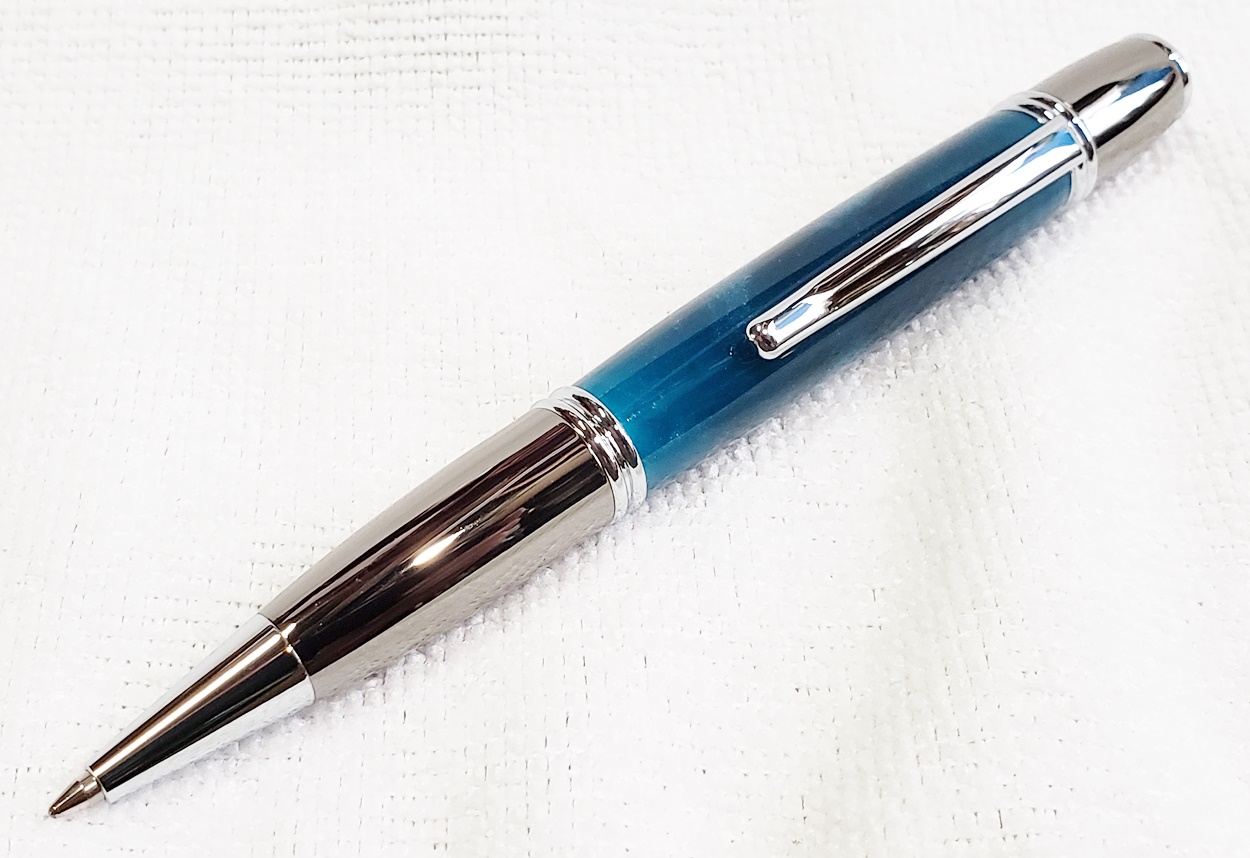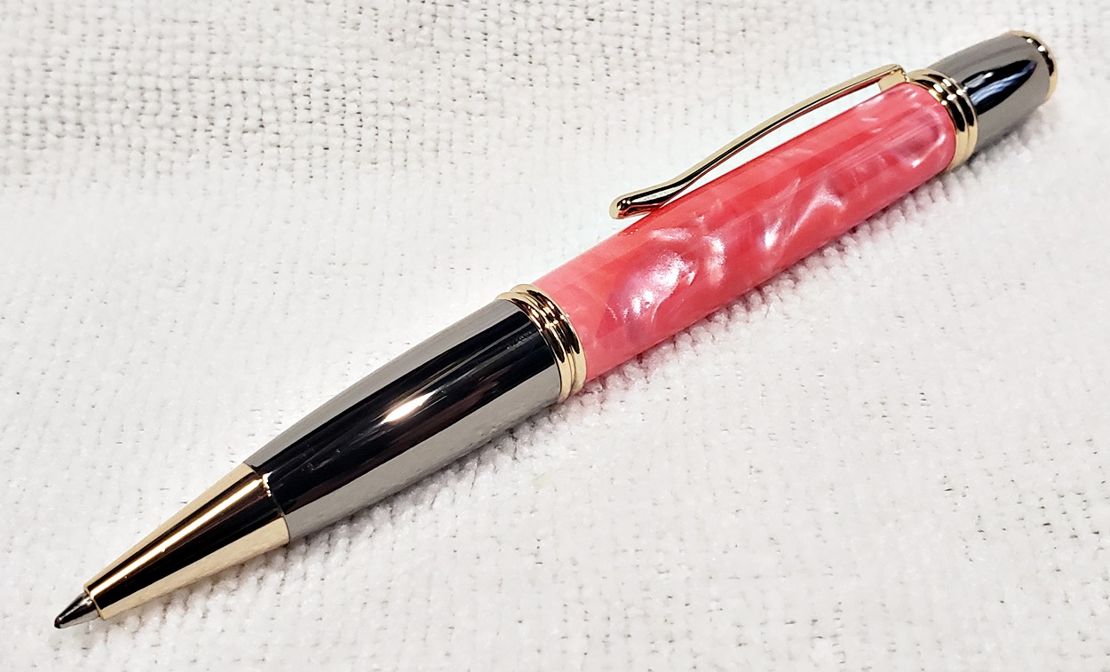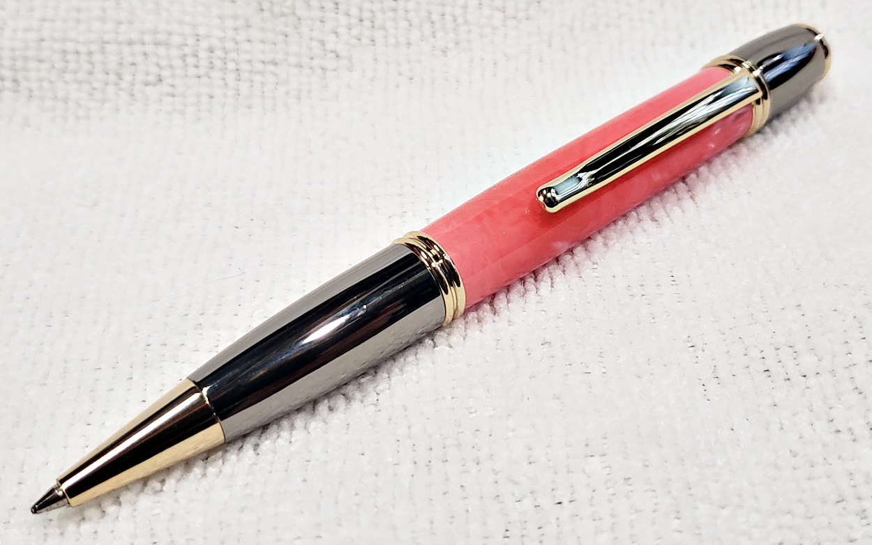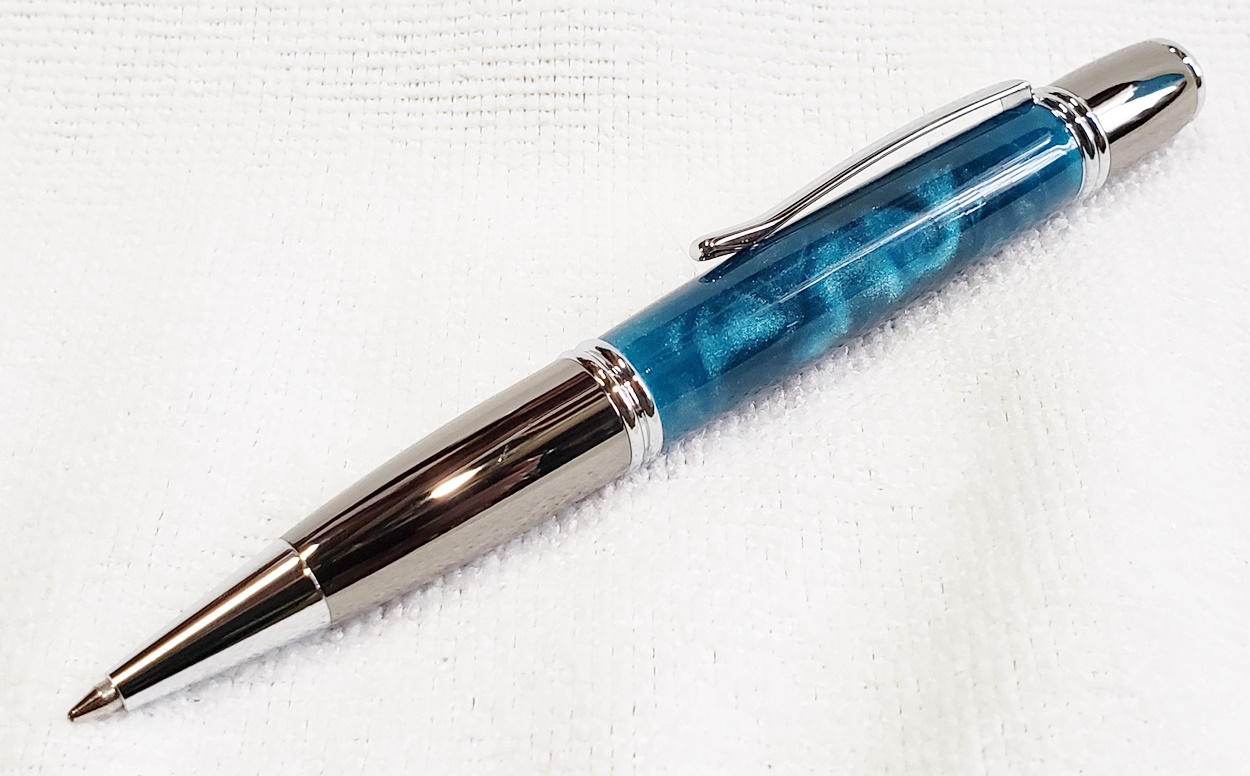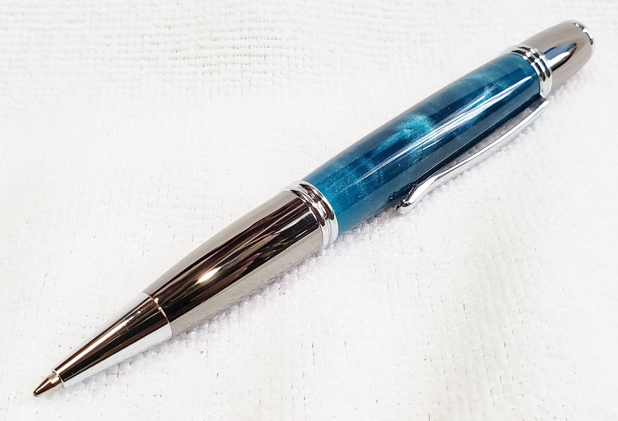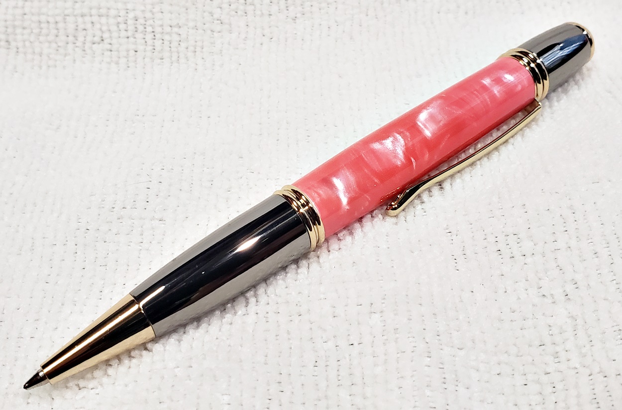 I made these for a friend's three kids, two girls and a boy. They are all PSI Gatsby pens, one in chrome/gunmetal, and the other two in gold/gunmetal. The blanks are Aquapearl Blue Green, Aquabright Purple Dream, and Aquabright Pink Dream. Elijah's favorite color is teal, I hope his is close enough. Maya and Ava were easy, pink and purple. I'm happy with them.