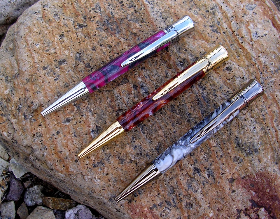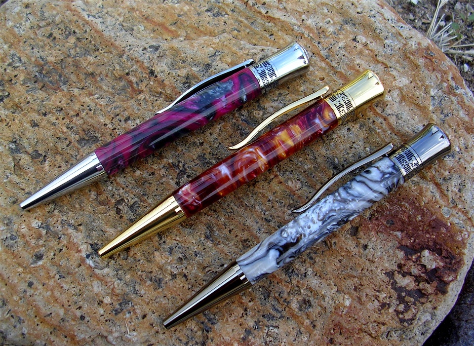 jjjaworski Member Joined Feb 22, 2012 Messages 920 Location Las Cruces, NM Sep 30, 2014 #1 Three Glacia pens in chrome, gold and gunmetal. Kits and blanks from BearToothWoods Attachments DSCN8449.jpg 446.1 KB · Views: 407 DSCN8450.jpg 485.2 KB · Views: 408