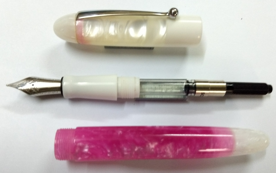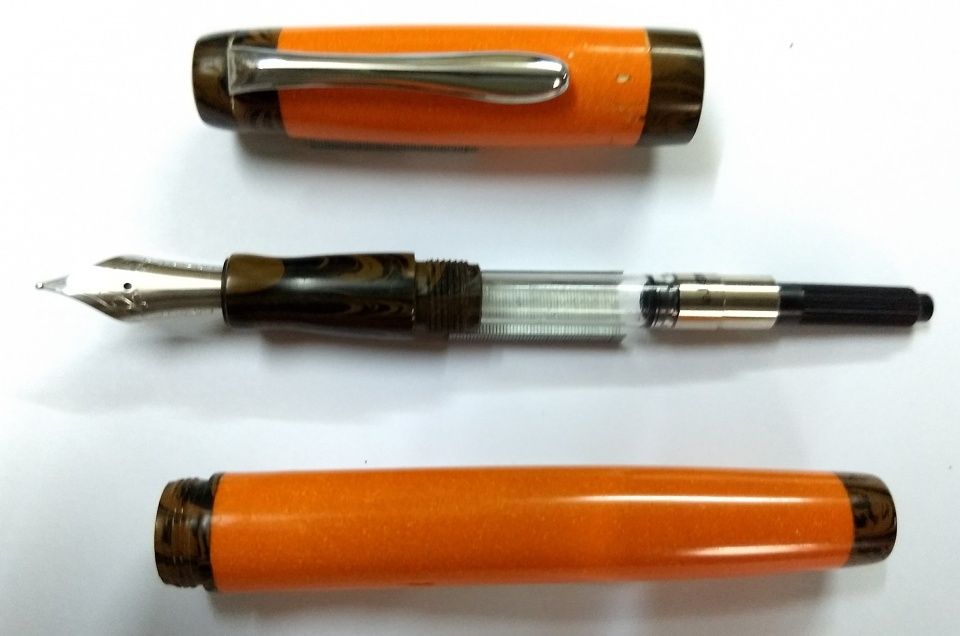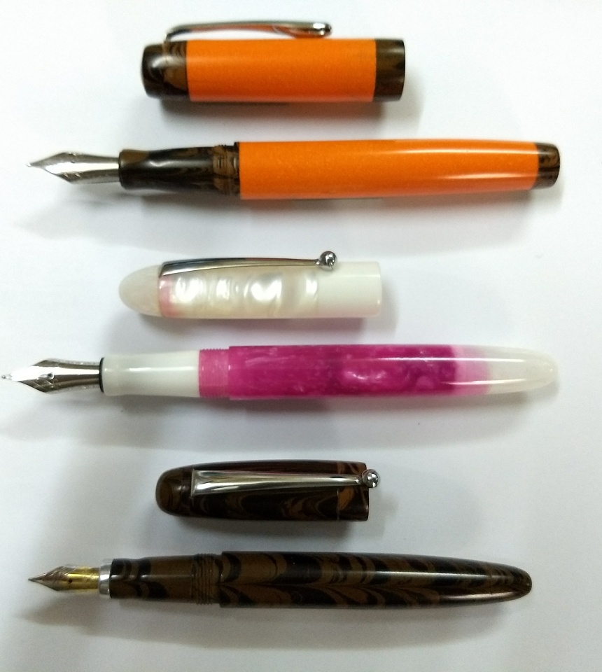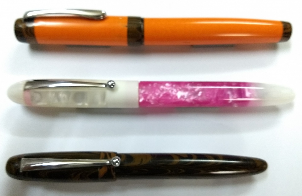 Completed these three pens this evening. The smaller one took some extra caution. The pink one is made from other blank leftovers. The orange one is very close to another pen shown recently, with a different clip. I am happy the way the pens turned out . Hope you like the design. Welcome comments and criticisms.