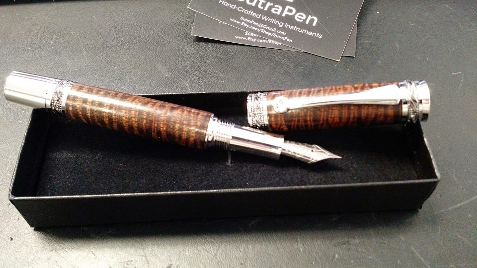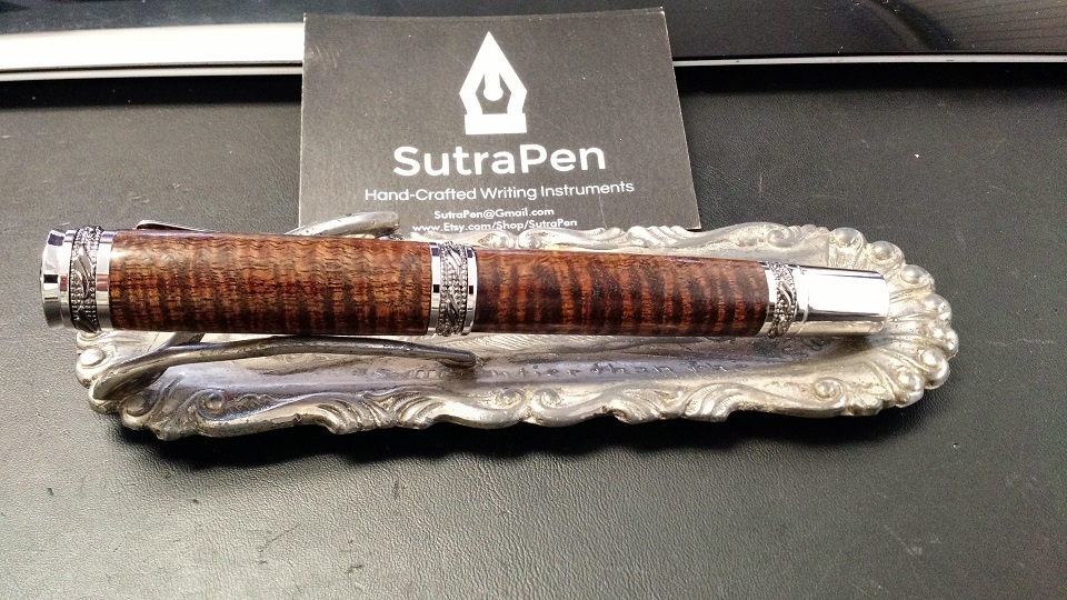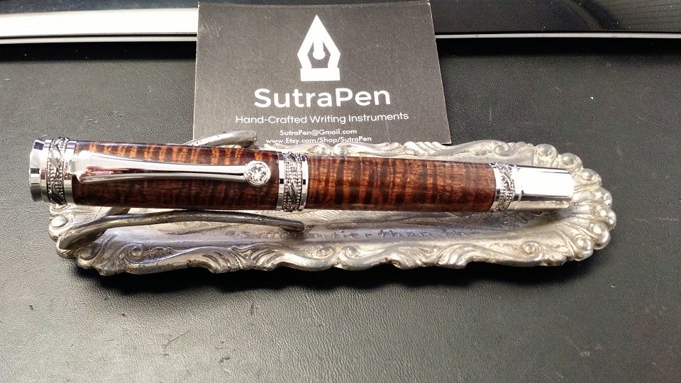 The third Majestic is a commission done for a repeat customer. He specifically wanted a Curly Koa pen in a satin finish. I would normally prefer a high gloss finish on the Koa to show off the chatoyance, but I think this slightly toned down version came out very nicely. Sorry for the cell phone pics on this one, but my light box was packed away and I just snapped a couple of quick pics before I sent it out.