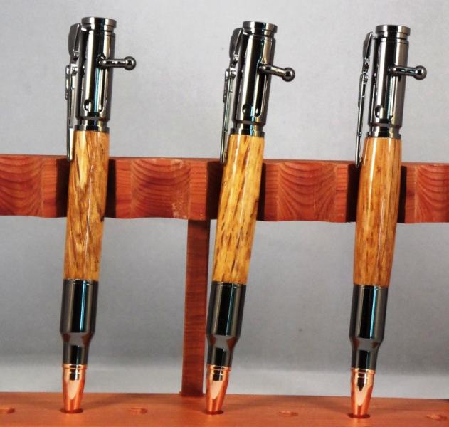 I made these three Bolt Action Pens (with gun metal finish) as a special order. They are made from white oak taken from the Stonewall Jackson Prayer Tree. I finished them with ten coats of Med CA and polished. I have been making Civil War Pens and now the Bolt action with the SJPT for some time now (since the tree came down) and they have been highly popular around here. Here is some background on the tree: