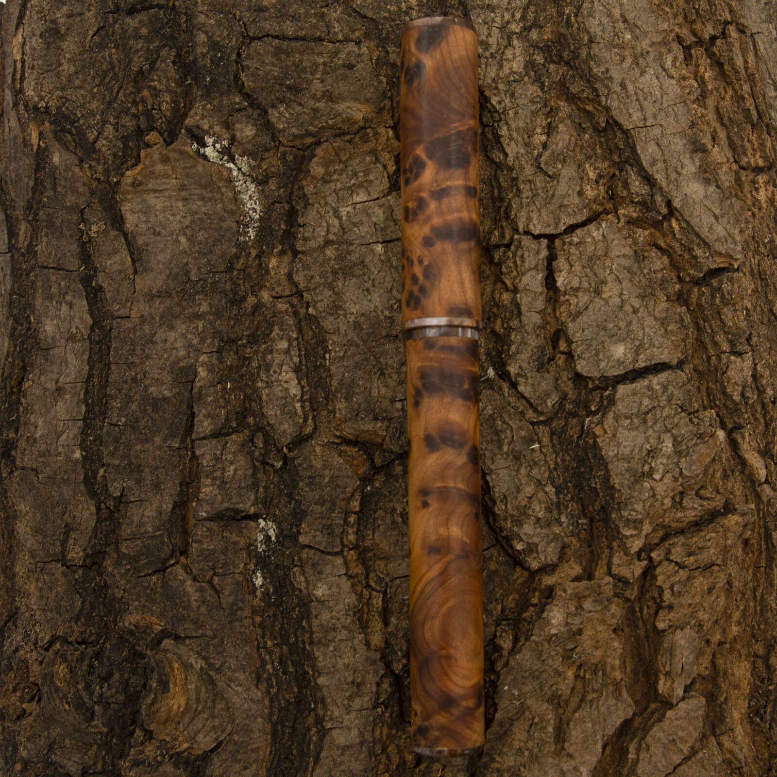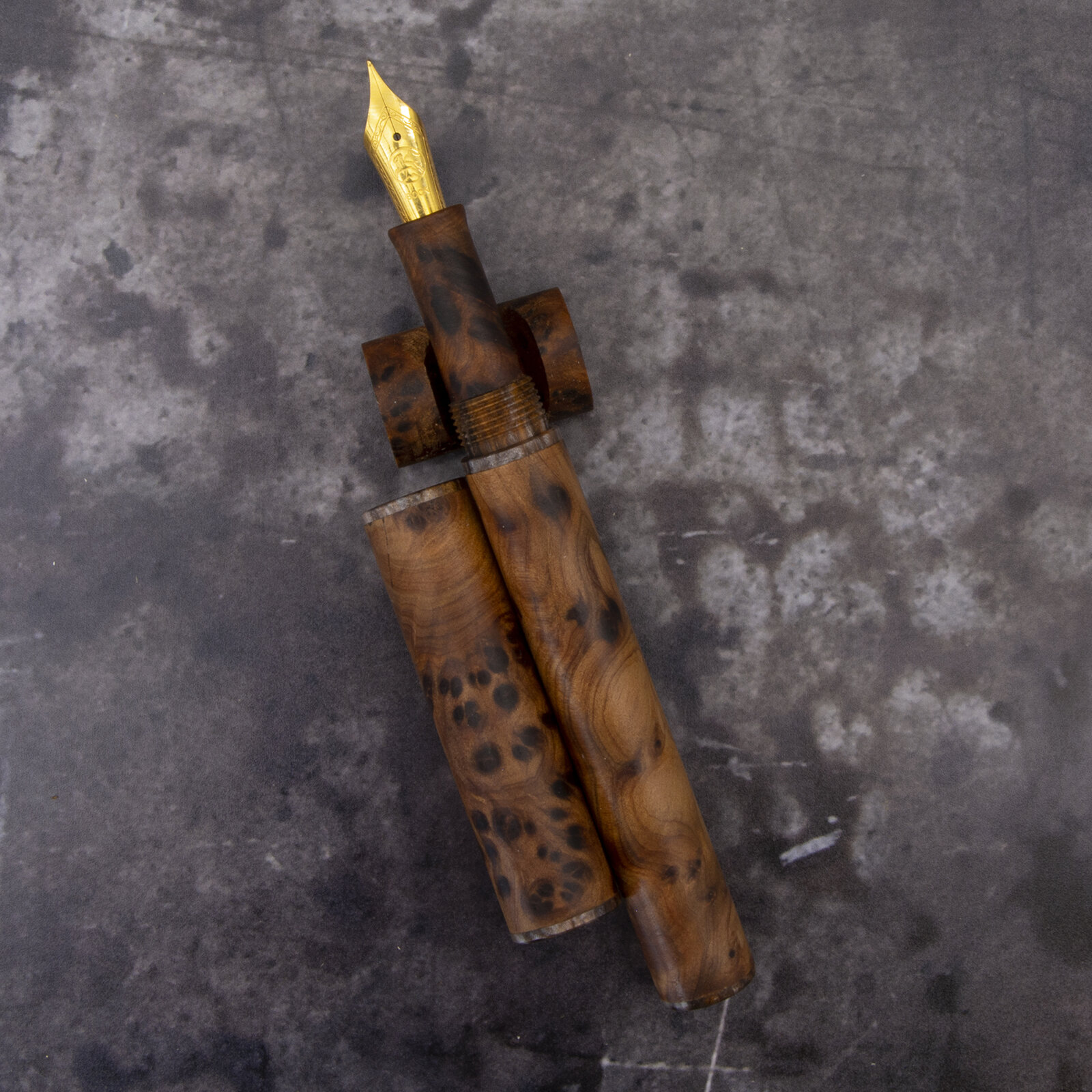 Thuya Burr lined and threaded with an acrylic from Lumber Jim studios, sporting s #6 Bock (F) nib. A very slight step and fine barrel taper.