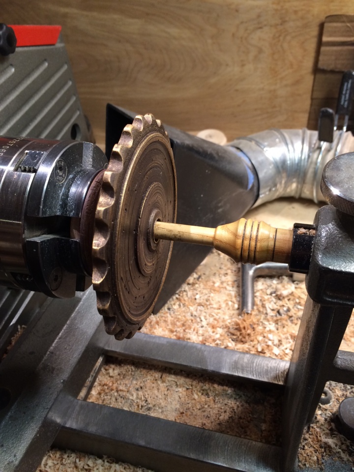 Normally when parting an item off the lathe, we use our free hand to catch it......when it is a toothed gear, I choose to go a safer route. With this piece, I used a wooden Morse taper mandrel (in the tailstock) from another project as the "Catcher" when the gear was parted loose.