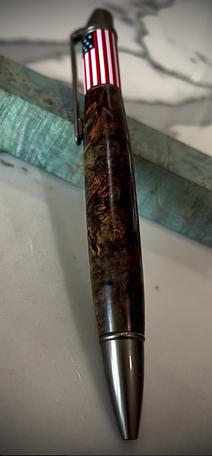 Purchased some stabilized Maple Burl from Benpen a few weeks ago and just turned the first blank. Great stabilization and I usually CA finish most wood blanks but decided to no CA finish this one. Sanded through all the micro mesh grits and then used Aussie Oil and just friction finish. There are some voids that are common in burl which I almost always fill with CA and bring down to a nice smooth surface and high gloss. I love Glu Boost it has been working very well but no Glu Boost on this Pen. Nice satin finish with some small voids which add character and some natural feel and taste to the pen. Enjoying mixing it up on this Pen. This pen is probably going to a dear friend of mine that is taking the oath on Tuesday, September 13, 2022, to become a USA citizen.