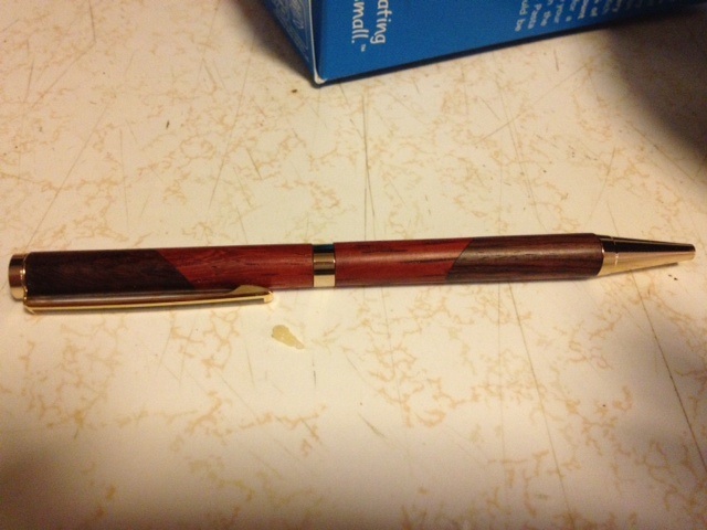Very cool, and great first pen. PSI also makes an economic modified slimline style, I believe its called "Comfort Funline", basically same parts except a wider centerband that allows for a little more pen girth. I made a bunch of this style as I was learning, and still like it for its size. My guess at the woods are Walnut and Padauk.