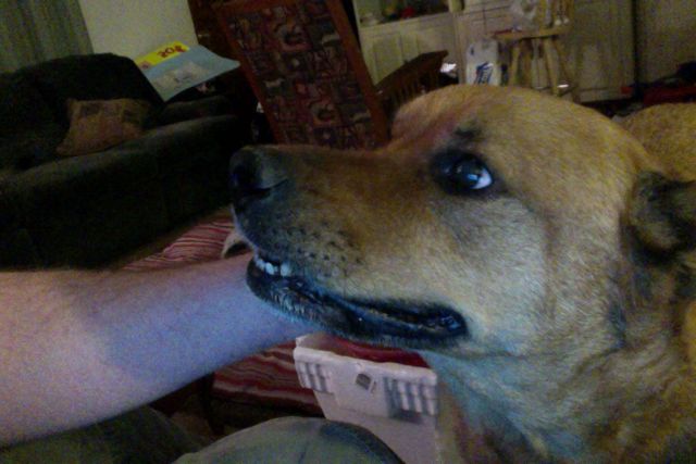 Apparently my dog decided I was spending to much time on the computer this evening. I heard her slurping water in the kitchen. Next thing I know she plants her slobbering dripping jowls on the keyboard and lets a big ol belch. She's a lovable 120 pounder.
