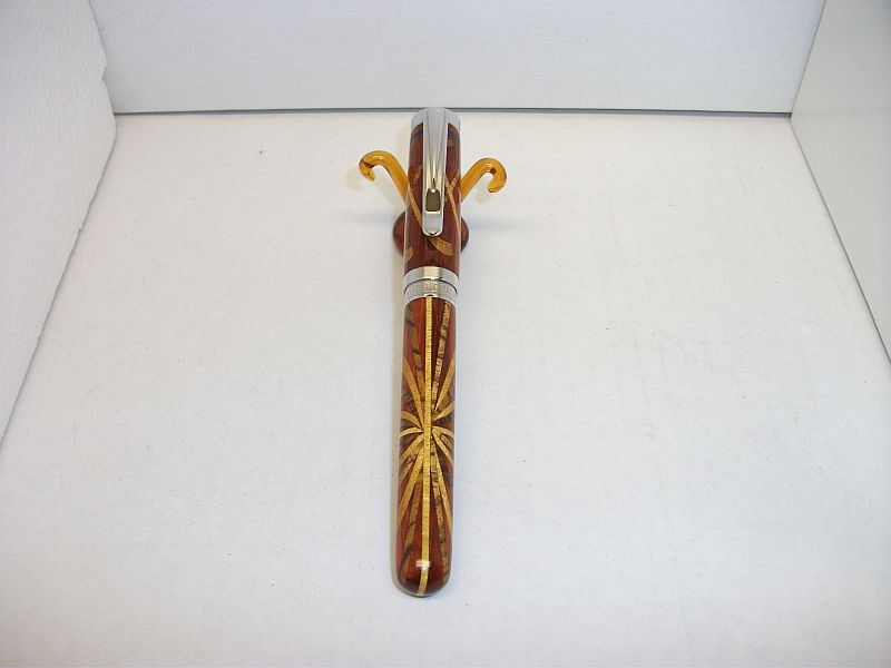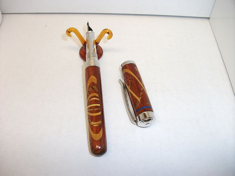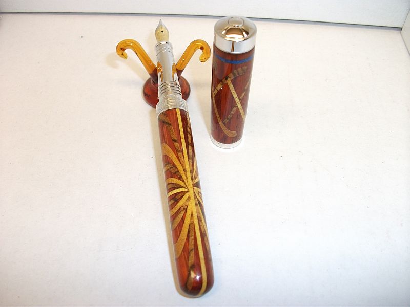 Hi folks,what we have here is a 3 wood closed end Citizen.The woods I used are Pauduk for the body with Yellow heart and Zebrawood inlays.The cap is a varied depth inlay pattern.While the bottom is done level.The starburst is cut in a 360 circle. The blue inaly at the top is sodalite trustone dust.I cut the groove after turning it close to size,filled it in using CA.