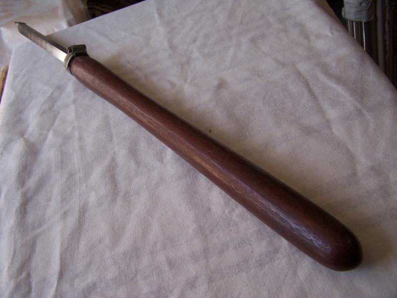 I turned this yesterday. I thought the spindle was Cherry due to the grain structure and other characteristics, but I'm not so sure now. I've turned and worked quite a bit if Cherry, but I've never seen any that exhibited the gren color of this handle. But it is done now and it is just a tool handle. I installed one of Cap'n Eddie's carbide cutters in it.