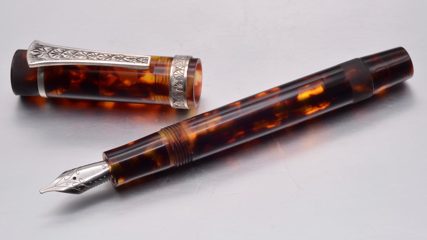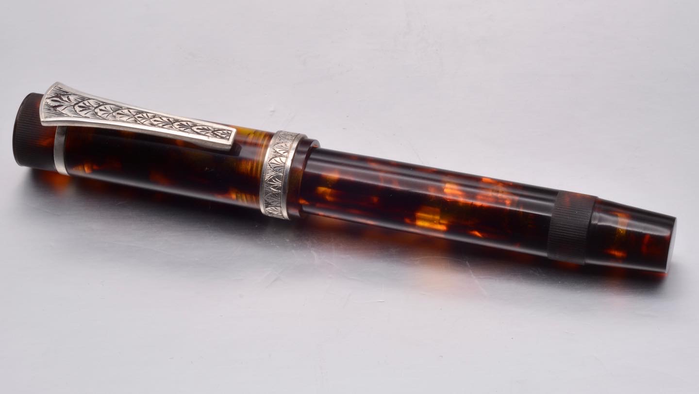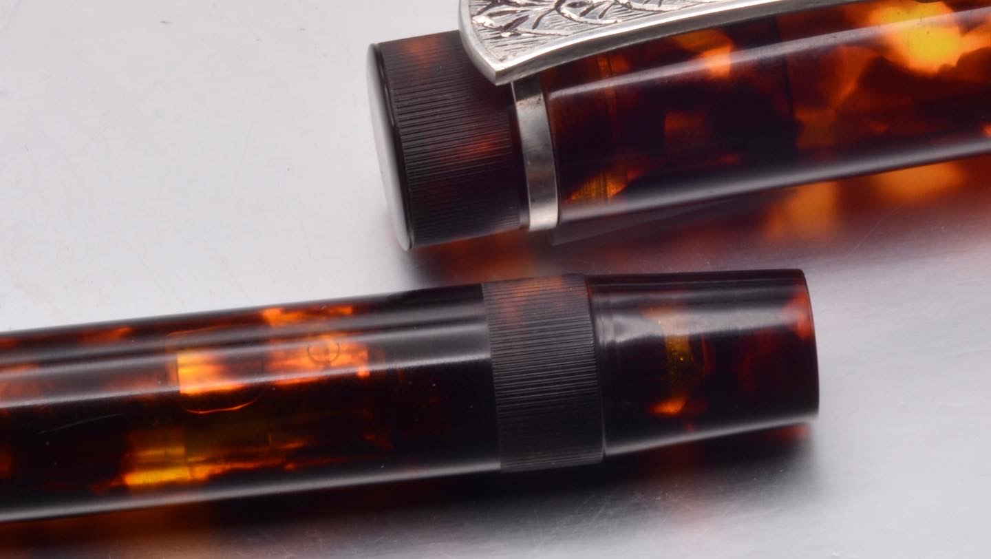 Fresh out of the shop. I wanted to make a pen that was somewhat vintage styled, so I came up with this. A flat top fountain pen in a very glowing and radiant tortoise shell resin. I added some fine knurling to the barrel and cap, and made the trim from Argentium silver, which I engraved. It's a modest sized pen, measuring in at about 5.25" capped. It has 13mm triple lead cap threads. It uses a jowo 6 nib.