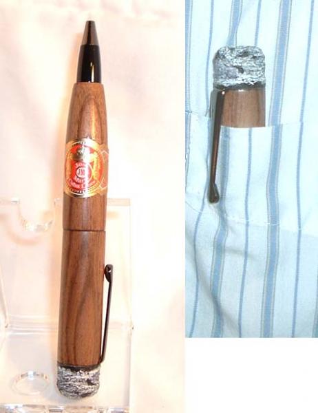 This is another prototype. Not too difficult to make but there are some things I'd do different. The band is a little crooked. Didn't notice that until I was cropping the picture. The clip is really tight and I need to move the centerhole some so it is less so. The wood is not my usual burl type but this was just a test pen. I'll wear it to work and see if I get any comments.