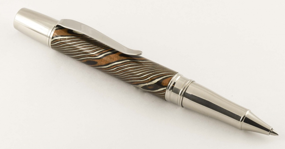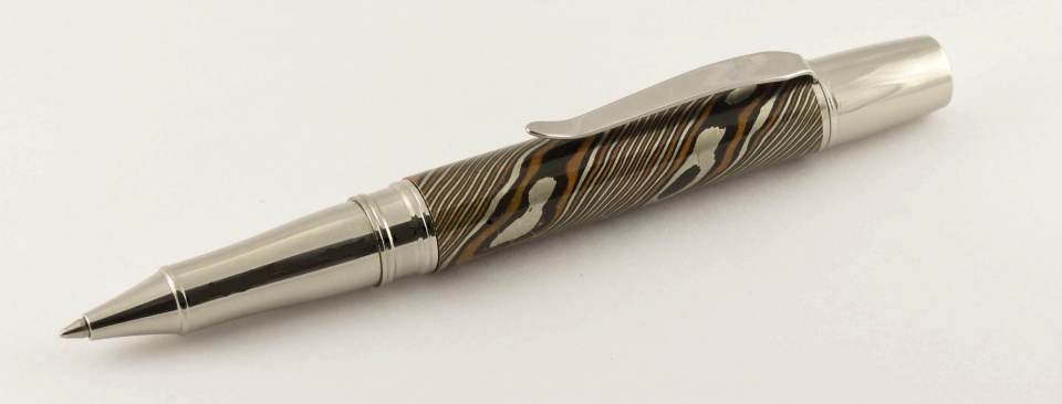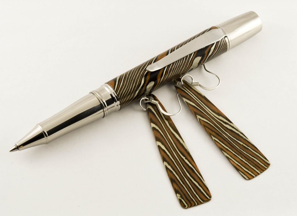 Turned from a solid round bar of twisted mokume gane with nickel-silver, brass and copper. On a Liberty ballpoint component set. Used leftovers in a rolling mill to make a set of earrings. Feldspar rubbed to shear off any smeared metal and patina applied to bring out all three colors. The pen is a bit heavy...or sturdy:wink:. Had fun making it! Doc