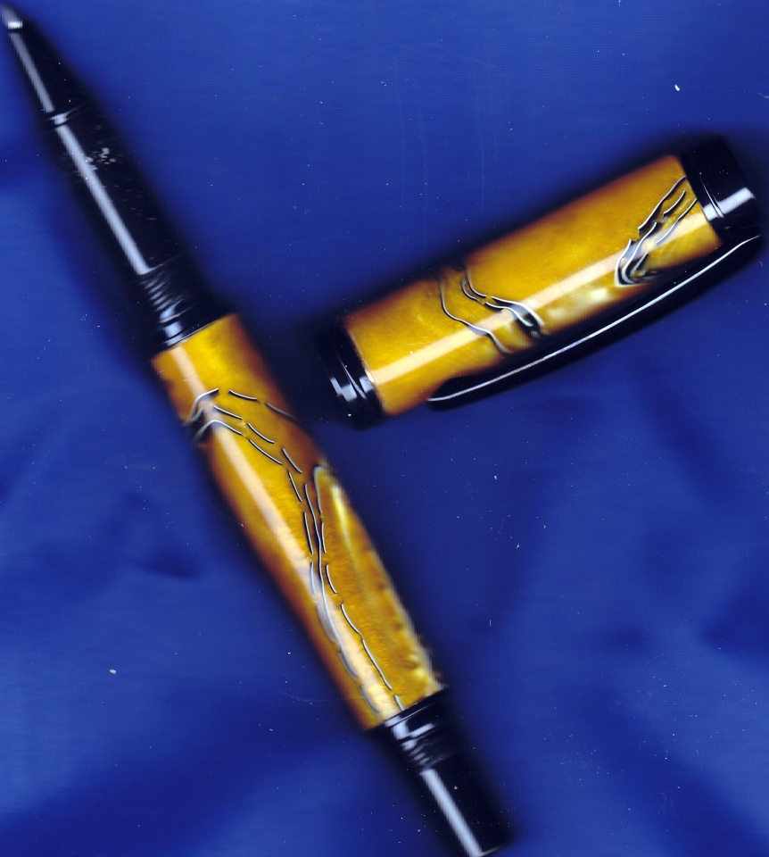 Not much of a picture but a pretty decent pen...Tiger Lily blank from exoticblanks.com on an SPW Caballero in Black Titanium (RD). Turned really easily with a custom shank using a round carbide blade. No finish...taken to 400 grit sandpaper then wet sanded to 12000 with micro mesh pads a coat of HUD two step wax.