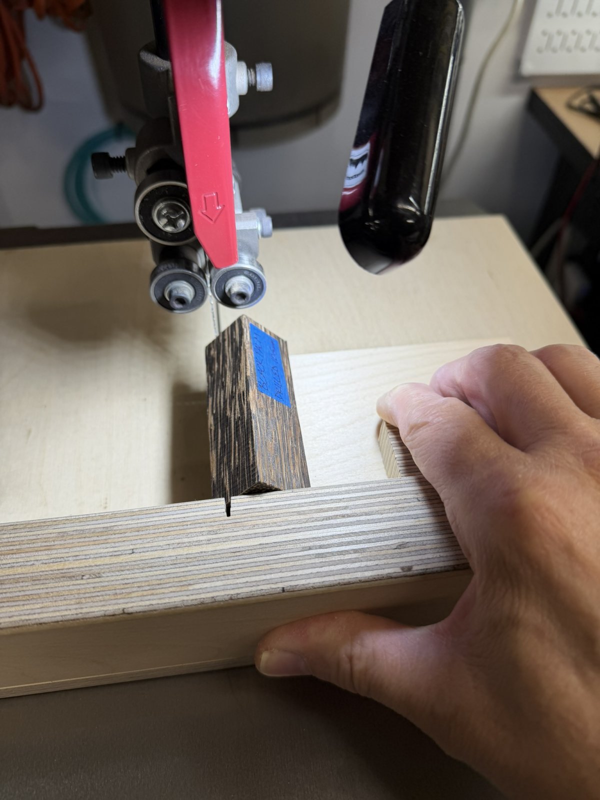 The jig I use is a simple one that I set on the crosscut sled I made for my bandsaw. I do hold the piece with my right index finger and that does get within 1/4" of the meat saw blade, so be careful. I suppose I could add a hold down. Here are a few photos.