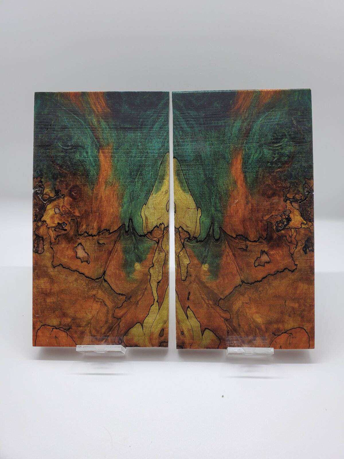 This beautiful set of spalted maple knife sales have been triple dye stabilized. The primary colors are ocean blue and orange with a hint of lime green. They measure 5 7/8 inches long by 3 1/8 inches wide and 7/16 of an inch thick. They have a coating of poly on them to help highlight the colors and details. $29 shipped.