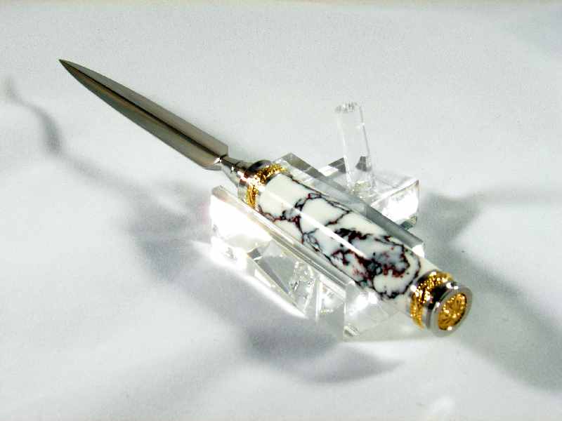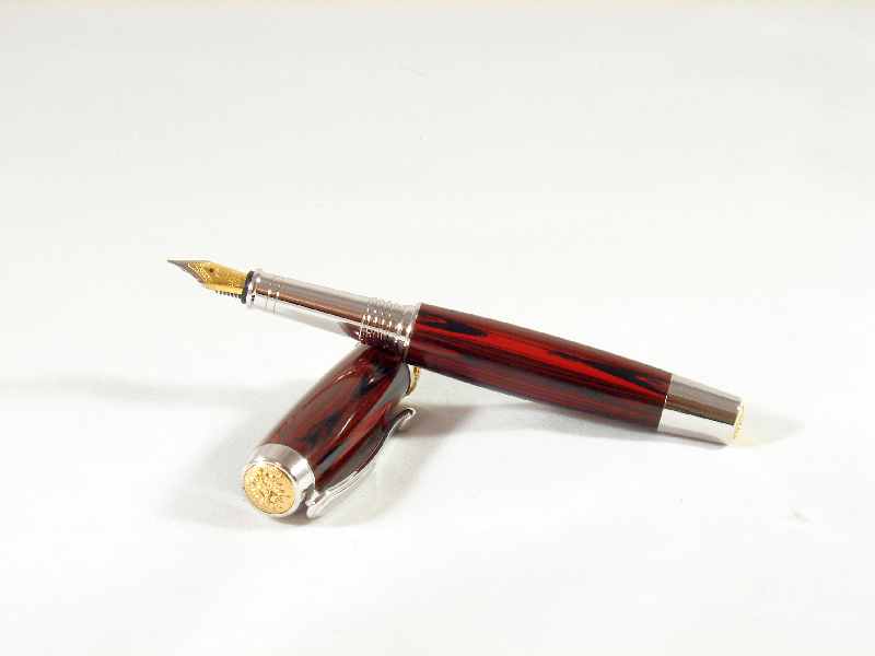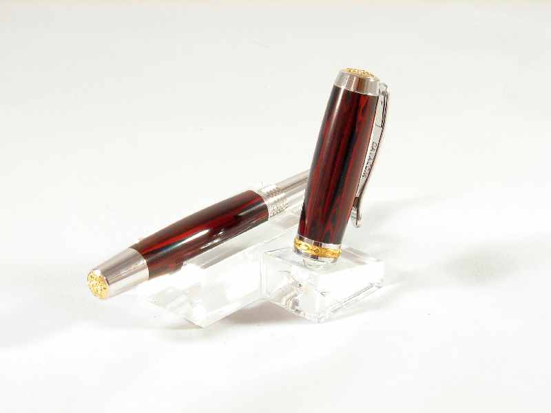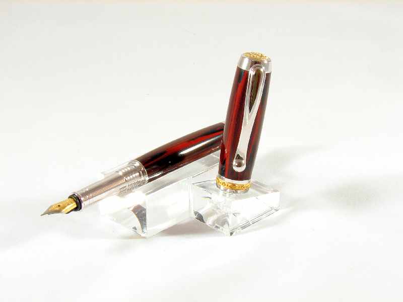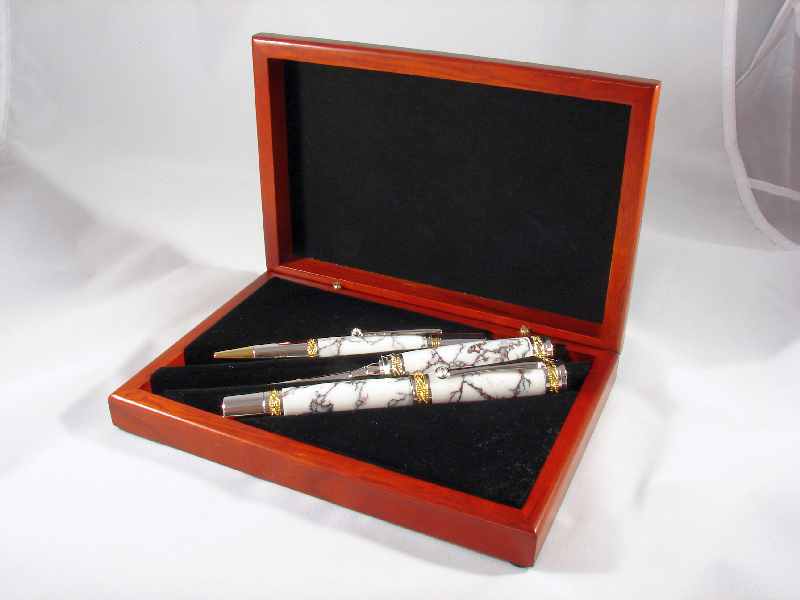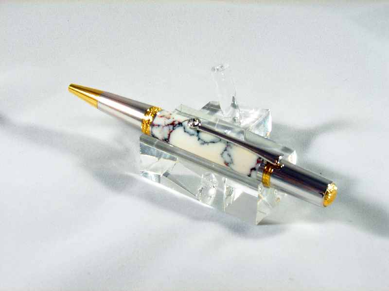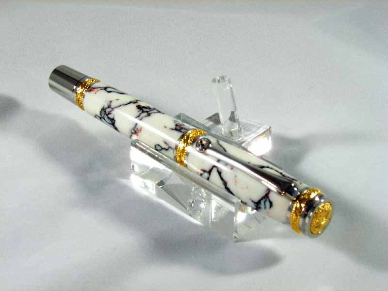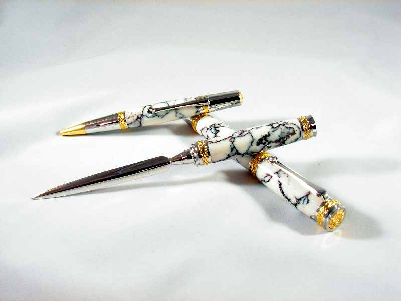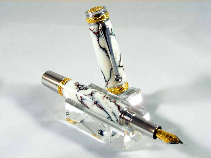 And the last is a Majestic Desk Set. It is done in Wild Horse Jasper Tru-Stone that I got from Richard from R&B Crafts. The three pieces are from the Majestic sets all in 22kt 2-micron Gold and Rhodium. There is the Full Size Majestic Fountain, Squire and a Letter Opener.