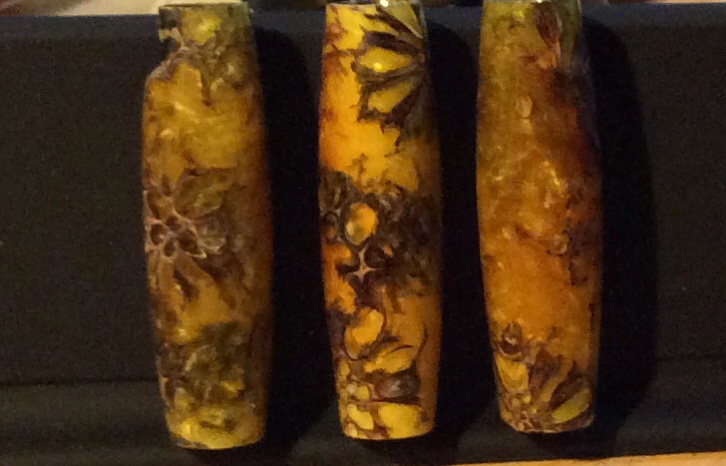 Since I have little experience with painting tubes, I decided to conduct an experiment. I turned three gum ball cast blanks made from the same brick with one tube painted black, one white and one silver. Unfortunately, I had a major blow out on the black tube which happens to be my favorite. From left to right black, white and silver.
