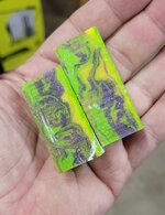 I was looking forward to this one. The blank is called goosebumps and is inlace acrylester, which seems to crack if you look at it wrong. It was going on a PSI Cameron kit. Something cool and a bit Halloween-ish. The bushing was far too tight to push in by hand even with some force, so I filed the tube well, making sure there was no residue of anything and even a little beyond that. Still no go. I've used these same bushings on many other kits with 12.5 mm tubes, so I know they fit. I decided to actually press the bushing in and then "disassemble" it to see if that would make it work. It was tough to press in, but didn't crack the blank. There was space around the tube for a little give and I used glue with some elasticity to it, so it would have been fine if the tube had fit the bushings. It was the clamp in the pen press that cracked the blank, only after having to tighten it more when the bushing wasn't budging. I should have tried putting it in front of the clamp to begin with, but did try after it was cracked so I could reclaim the bushing. Anyway, trying to push the busing out actually bent the pen press handle a little. I ended up pounding it out in a bench dog hole using a transfer punch and a hammer. Dang. I've never had a tube that far off in size. After driving it out, I still could not push it back in by hand. I guess I'll be using a different tube for whatever else that kit will be dressed in. There's no way I can save that blank. Those hairline cracks stick out like a sore thumb on inlace and mica pearl blanks. I wonder how it would look if I "shattered" it and put it back together with black GluBoost? It might be cool if it ended up with that kintsugi look to it. Then again, IDK if I want to waste more time on it. It'll be in a scrap bin at least for a while for me to think about. Bummer.