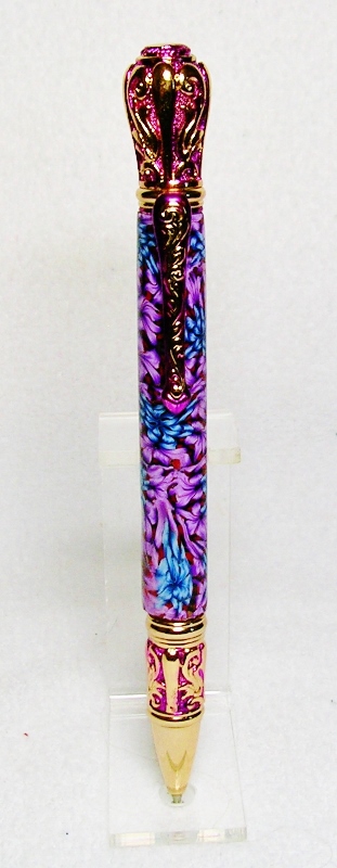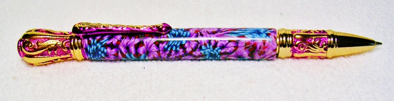 First Polymer Clay pen I have done in quite a while. The kit is a PSI Tudor in 24k Gold fittings. which I have added purple alcohol dye to the backgrounds with my 3 hair sable brush. Polymer blank was made with a mixture of flowers and colors. I think the alcohol dye takes the not so impressive tudor kit to a more pleasant looking finished product. Finished with 8 coats of thick CA sanded to 1600 and Polished with One-Step Plastic Polish. Jim S