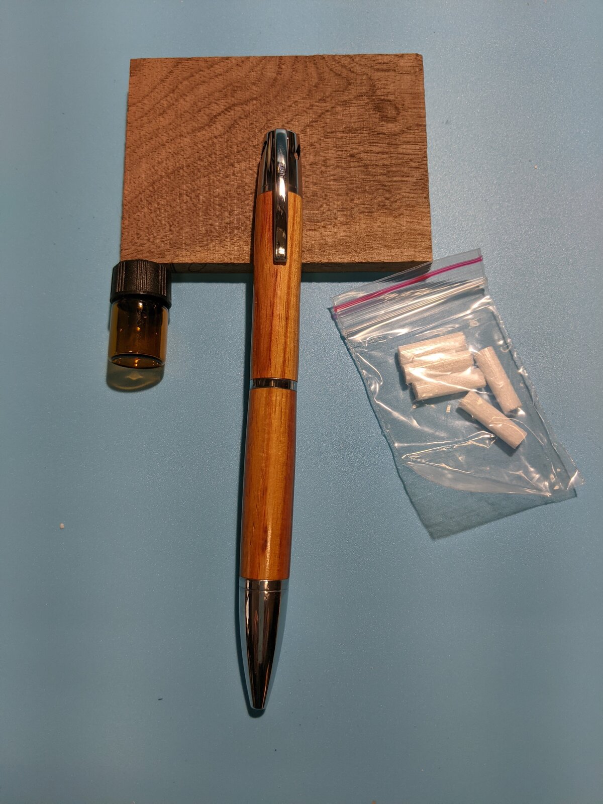My youngest granddaughter asked for a pen but had no idea what she was looking for. She's really into aroma therapy and I had a couple of the PSI Aroma Therapy kits that I had no idea what I was going to do with. The kit was a perfect fit for her and I thought Chrome would really set the wood off. The wood is Tulip wood from Bell Forest Products and it was a treat to turn. The finish is 4 coats (24 hours between coats) of WOP and buffed on my Beall buffing system and followed up with a light buffing with Renaissance wax. Thanks for looking.