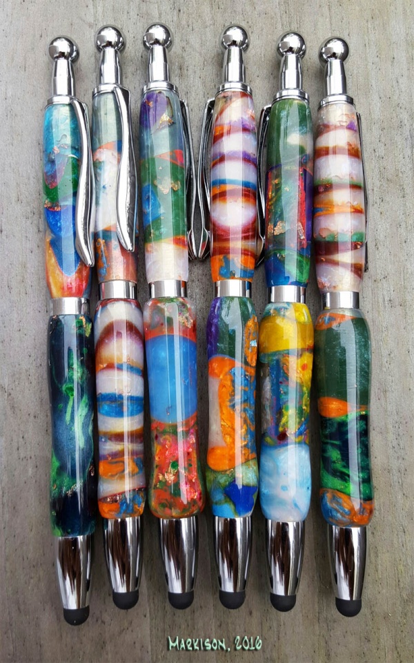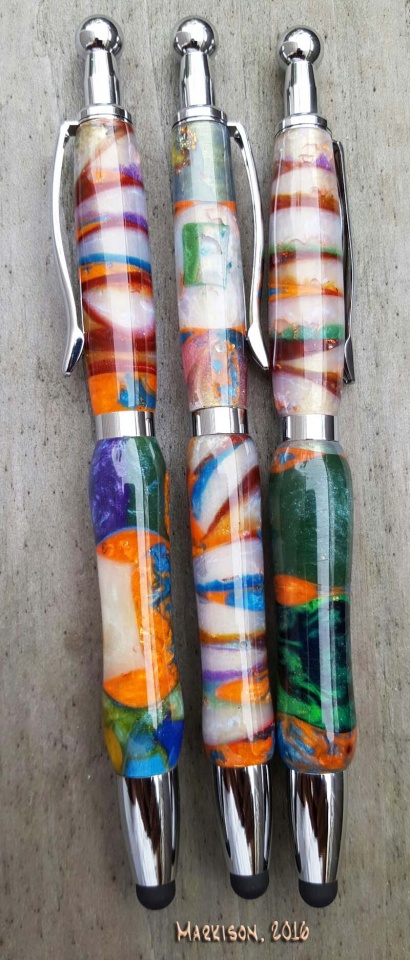 The rings on the 3 pens in the second picture were color-contained by interposing wafer-thin precast (same polymer resin) discs (separate explanatory thread to follow after I refine the technique a little further with various materials).