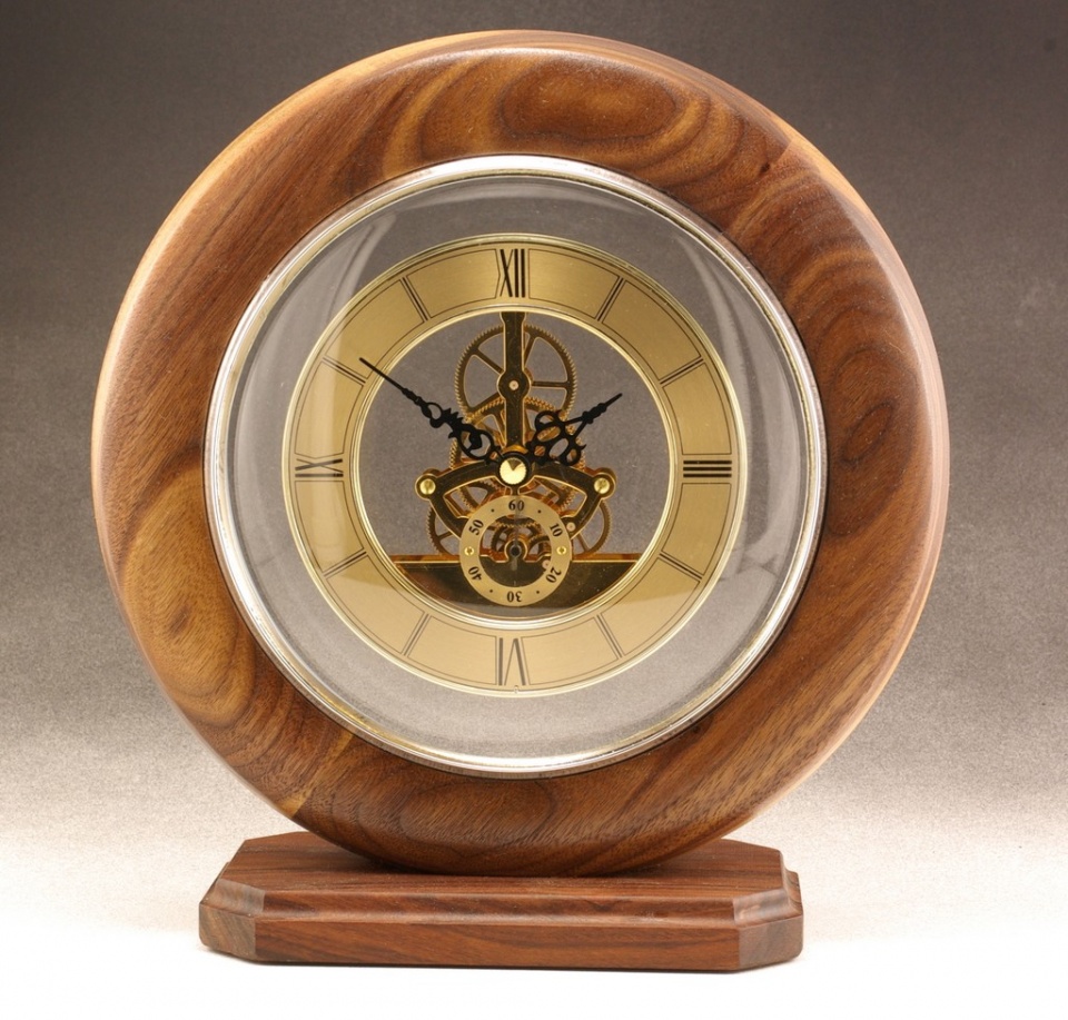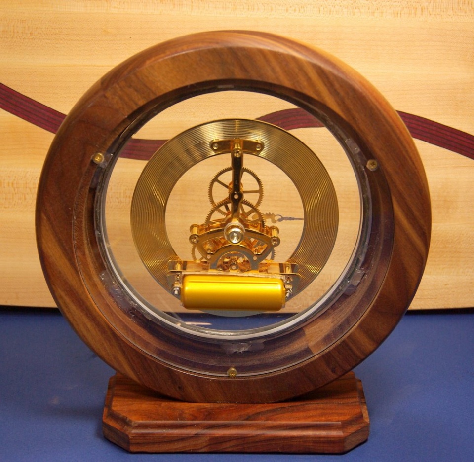 I took a break from pen making to play around with something different for a change. Here's a Walnut clock surround on a Rosewood base. The clock measures 9.25" dia. I turned a piece of polycarbonate and scroll sawed it to attach to the rear of the skeleton movement so that the mechanism arrears to "float" inside the ring. It was difficult to photograph due to the convex glass that I repurposed from a $9 Walmart clock :redface: