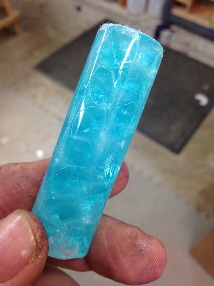 This was actually small saphire looking acrylic diamonds that my wife picked up at a craft store. I first cast them in Alumilite but I should have known that Alumilite will not bond to certain things including itself. So I cast some more in PR with a little white pearl (just a little) and put it under pressure at 80psi. When I cut it I noticed that the heat affected the acrylic as if it was plexi glass. The first piece I drilled I had to drill with water to cool down the blanks. It turned really well with a sharp skew and I didnt sand it at all. I just micro meshed it and finished it of with novus 2. The look of this thing in person resembles crushed glass. I havnt made a pen out of it but thats coming next. Thanks everyone