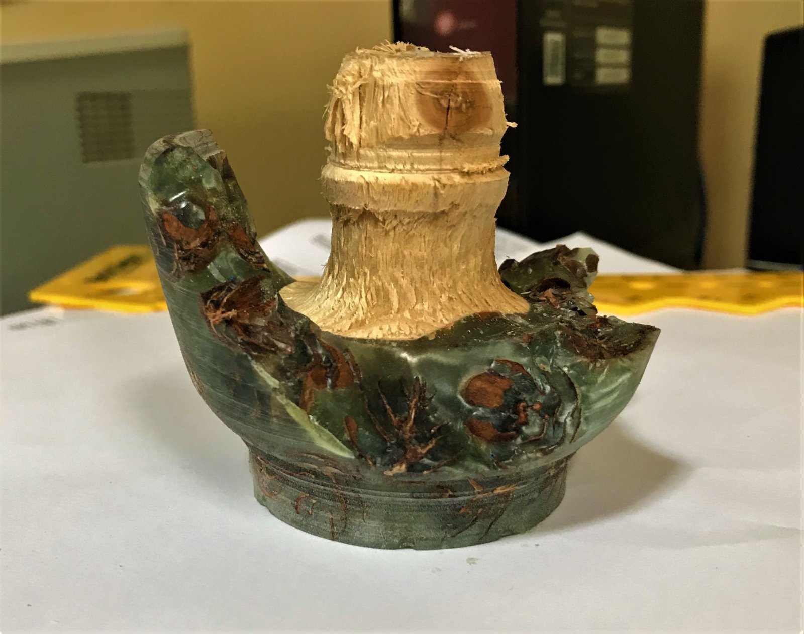So, here's why you always undercut your tenon, even when you're using serrated jaws. I just assumed the resin would give enough "bite" to hold it and I got careless. It was going to be such a beautiful pine cone and resin bowl... I wonder what I can do with this chuck?
