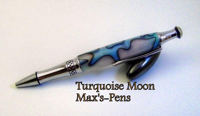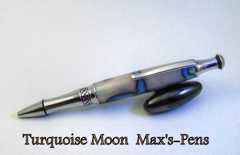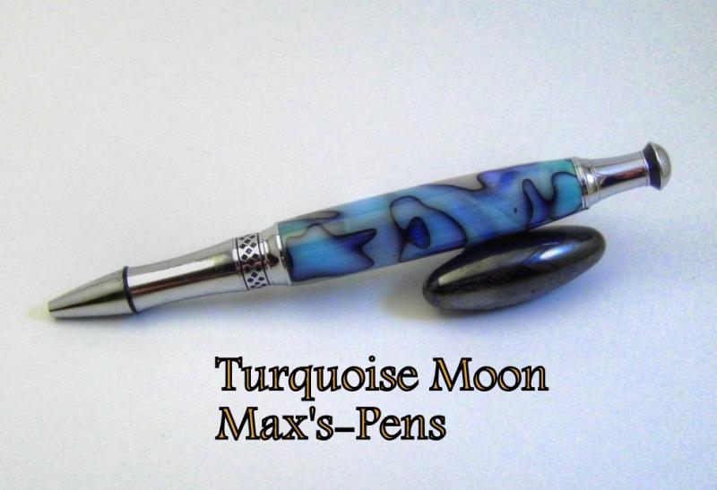 This is the Turquoise Moon Blank from Bear Tooth Woods on the Chrome Phoenix from Wood turningz.