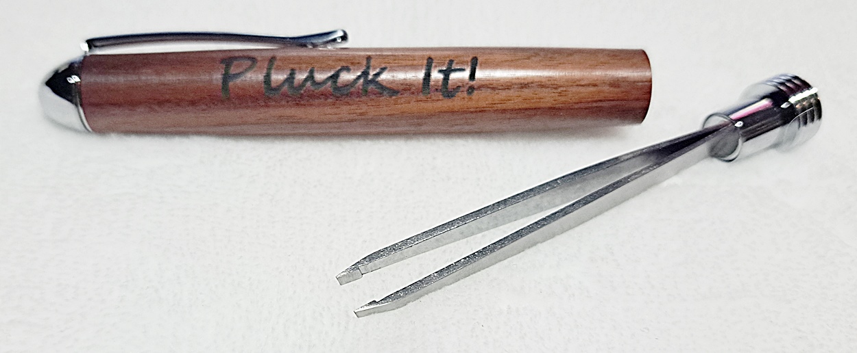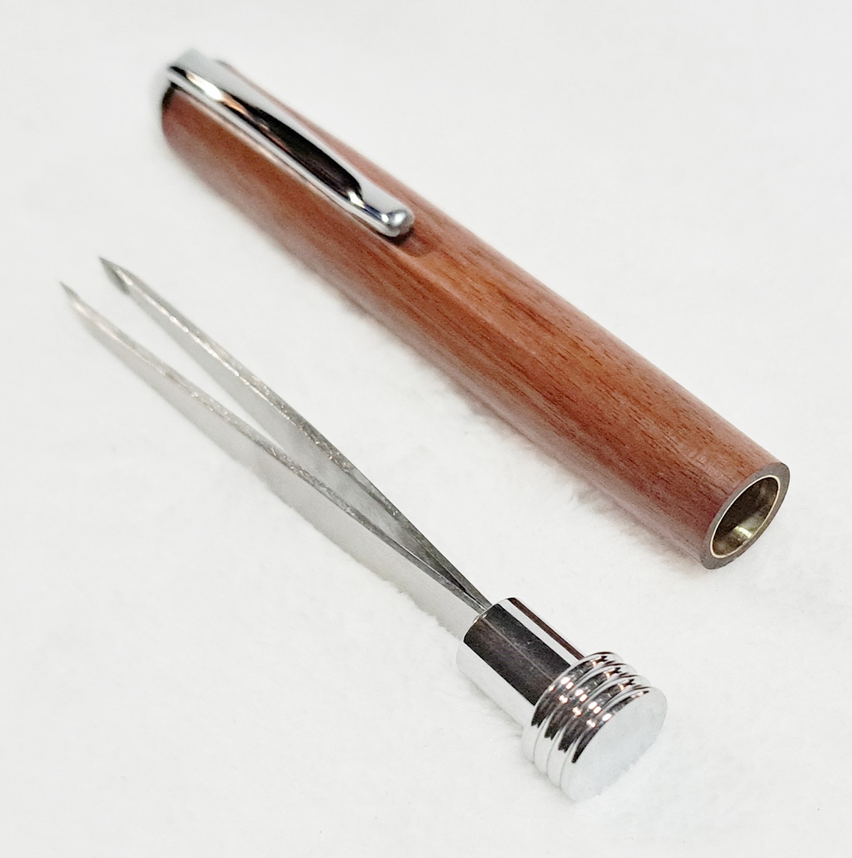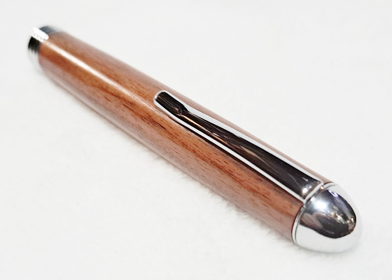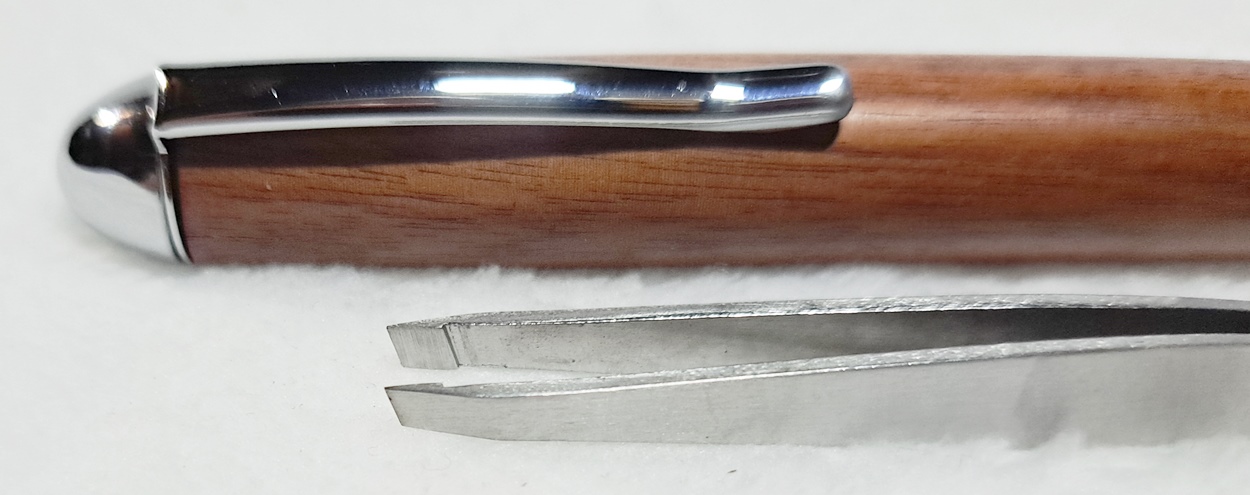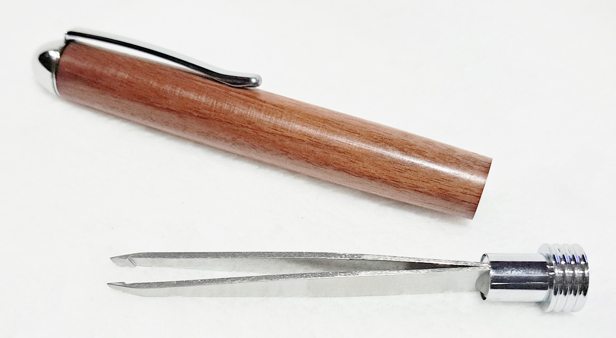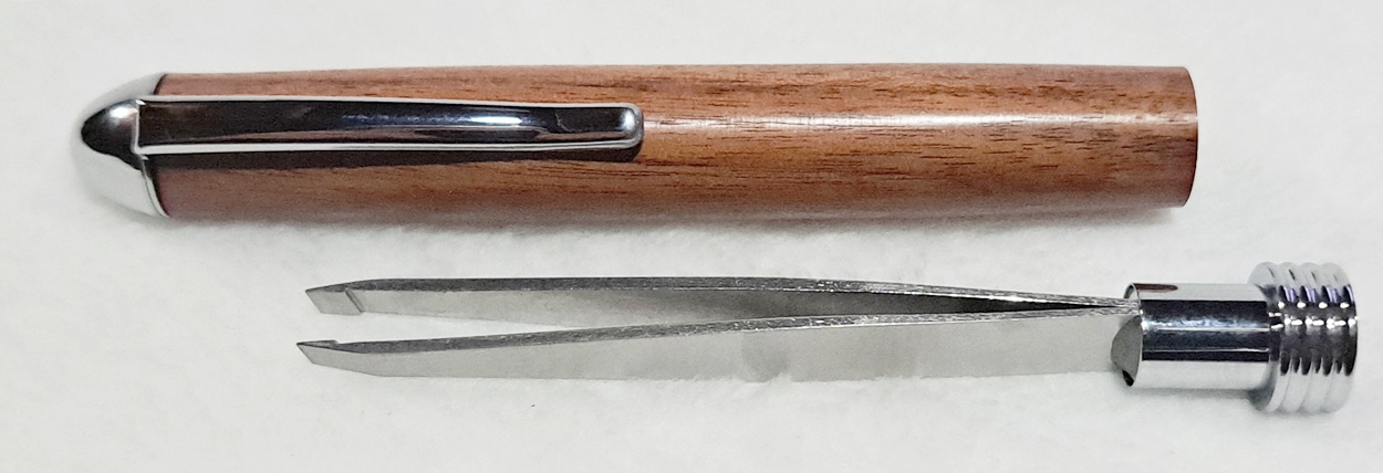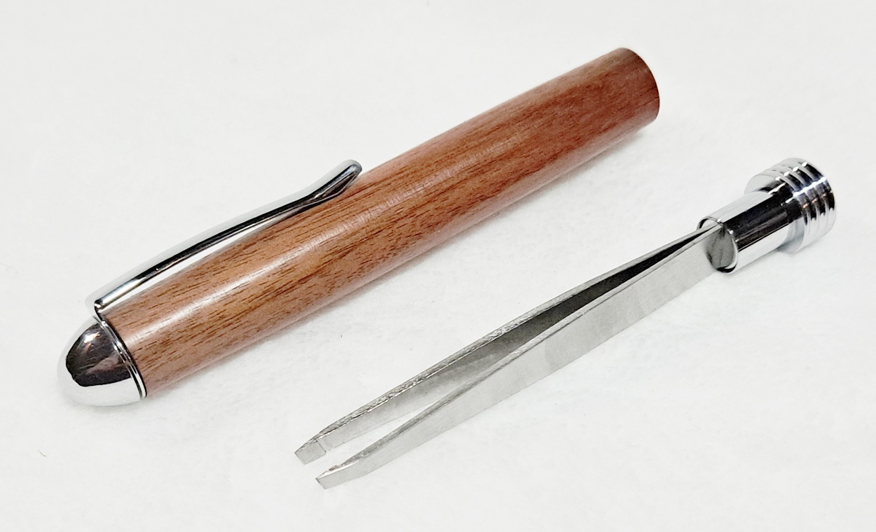 This is a Tweezer in chrome from PSI. The wood is Bolivian rosewood from Woodcraft. The finish is Pens Plus.