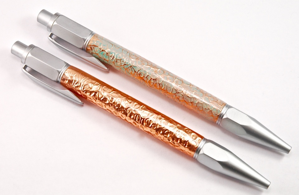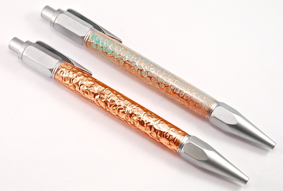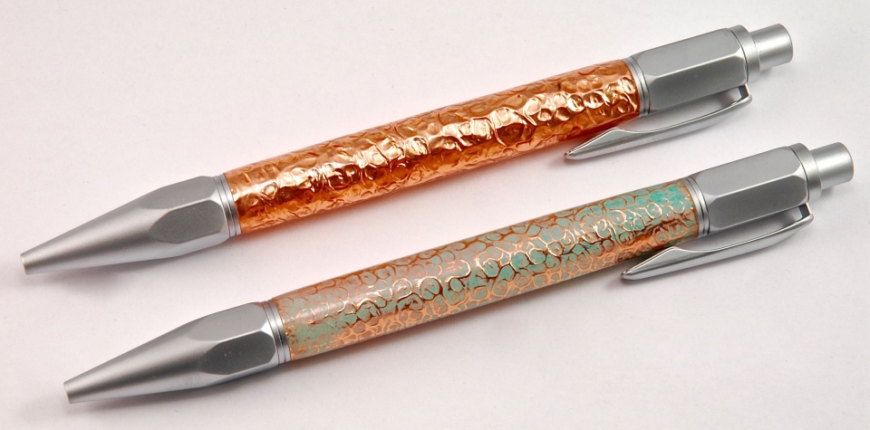 These are PSI Vertex Satin Click Pens done in Hammered Copper and Hammered Copper with a light patina applied. I used Freds (ptownsubbie) silicone molds, Alumilite and both were pressure treated, of course!