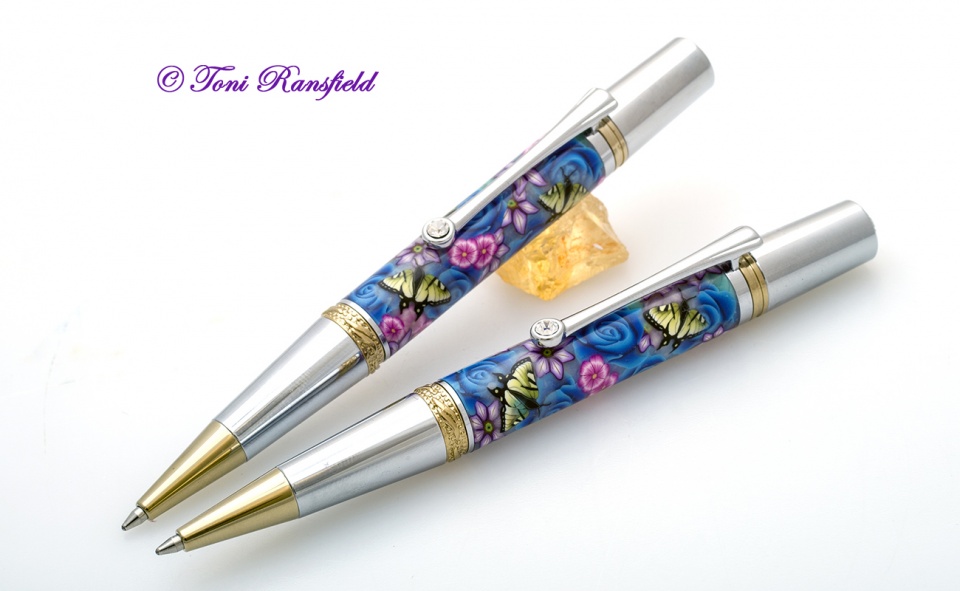 Well as close as I could get them to be Polymer clay covered pen blanks in blue Roses with Yellow Swallowtail Butterflies. Fitted on the Majestic Squire pen kit. Love them!!