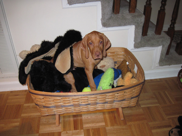 This is Oorah, our latest addition to our Vizsla family. He is as high drive as his name suggests (be careful what you name your dog). Just received an order from WoodNWhimsies (promptly delivered) that included thin and thick CA. I had not yet put the CA in the shop. When I came home the better half informed me that on two separate occasions she had to pull CA bottles out of Oorah's mouth. The thick CA had a puncture in it.