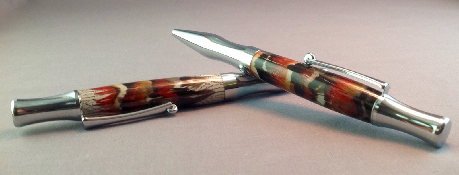 With the cancellation of almost all spring shows, and at least early summer events in doubt I'm not in any hurry to turn pens. Working to ge the garden ready is my main task, however with the rain today I got these three finished. Red Lady Amherst & Temminck Tragopan feathers along with a Breitling watch dial.