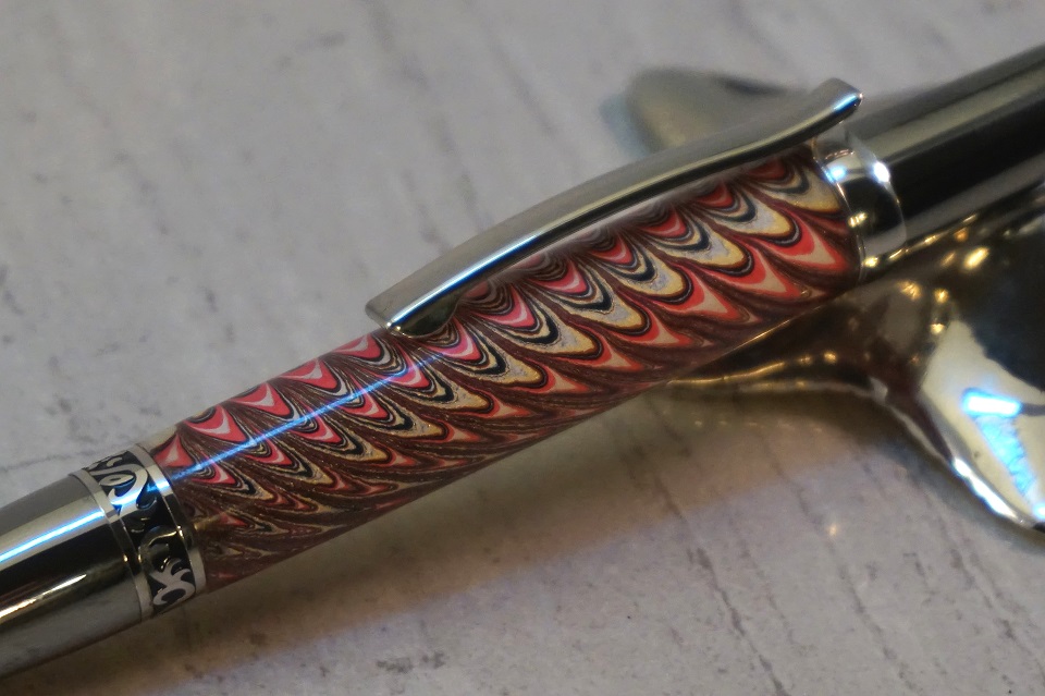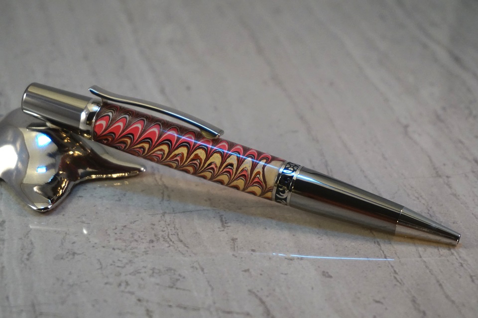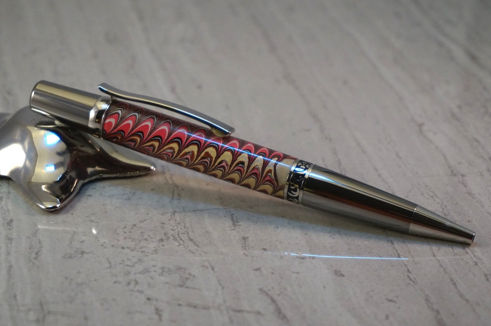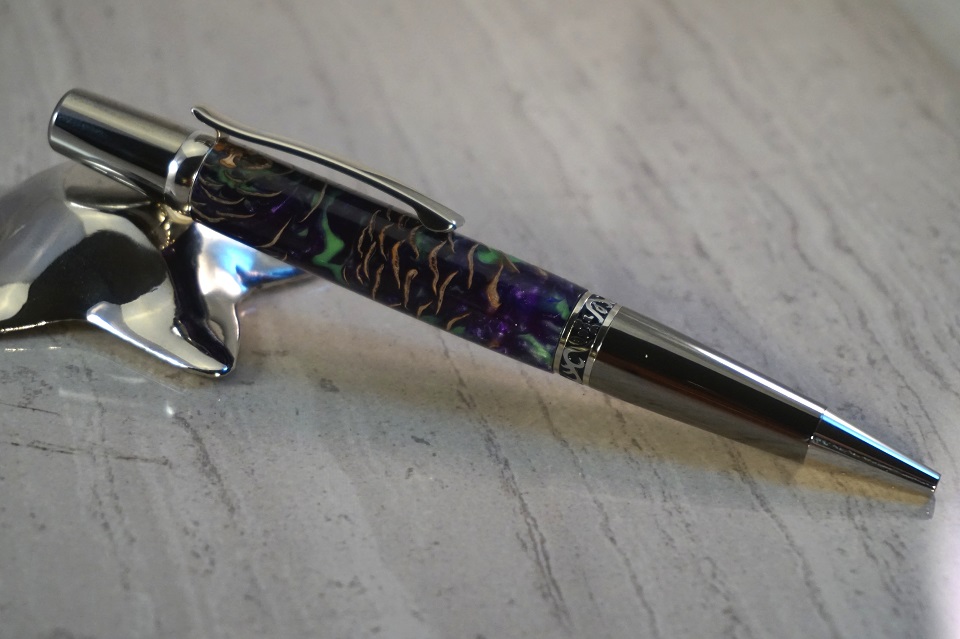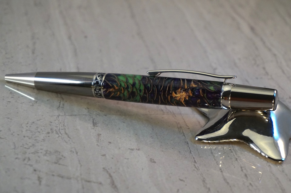 The first is an Italian Marbled Paper on an Elegant Wall Street ii while the second one is Purple and Green with Mini Pine Cones (my first time with this type of material as well) on the same hardware. I'm not sure if I should have finished the pinecone blank, but I suspect maybe I should have. As it is I like it a lot.
