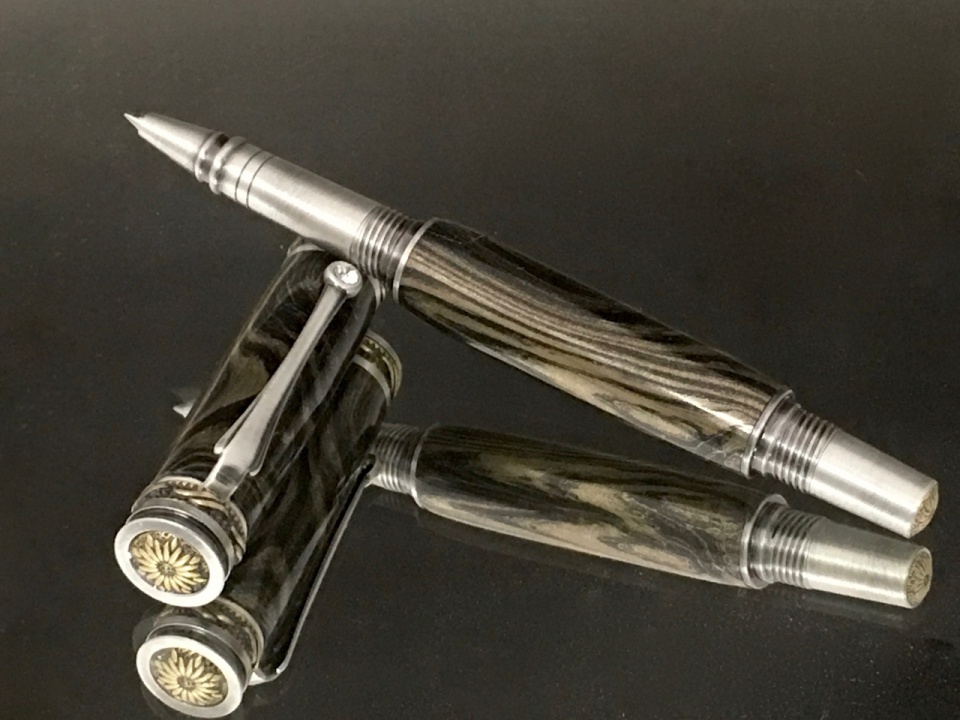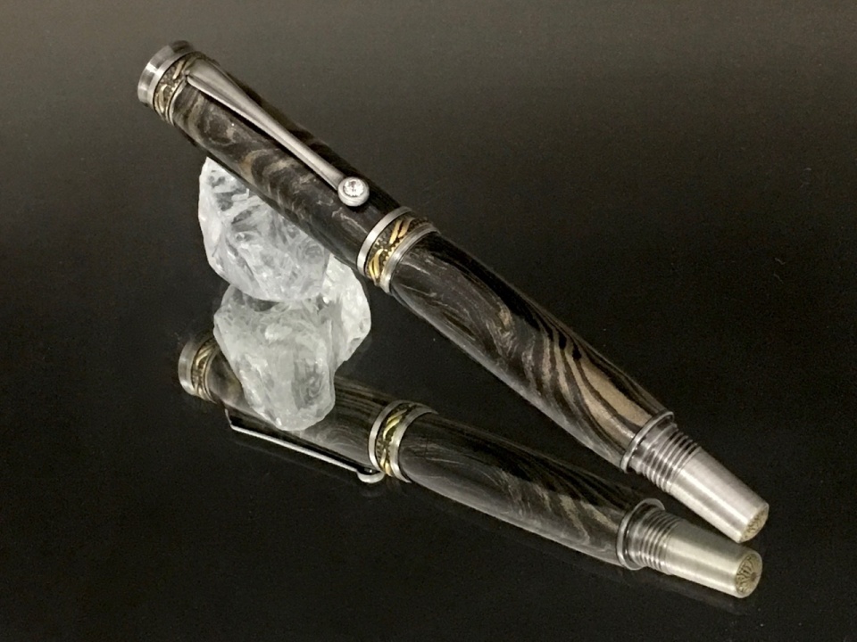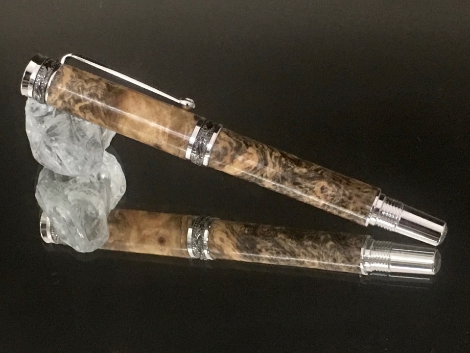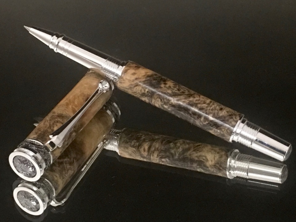 The first is a stabilized, black dyed buckeye burl I got from Steve Guzy. He did a great job with the blank. Mated it with the Jr. Majestic in chrome.