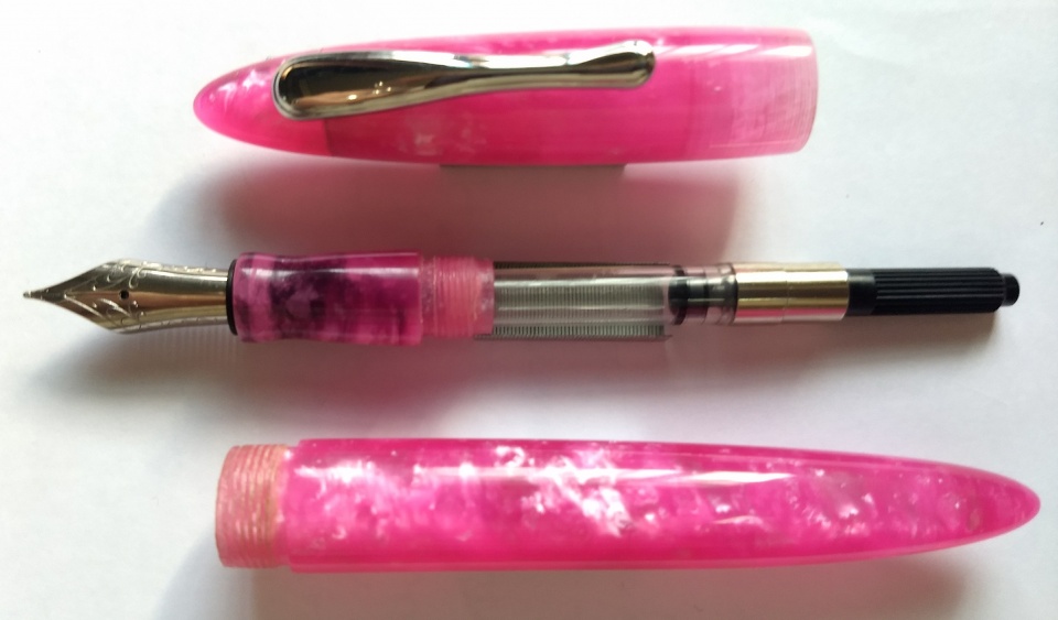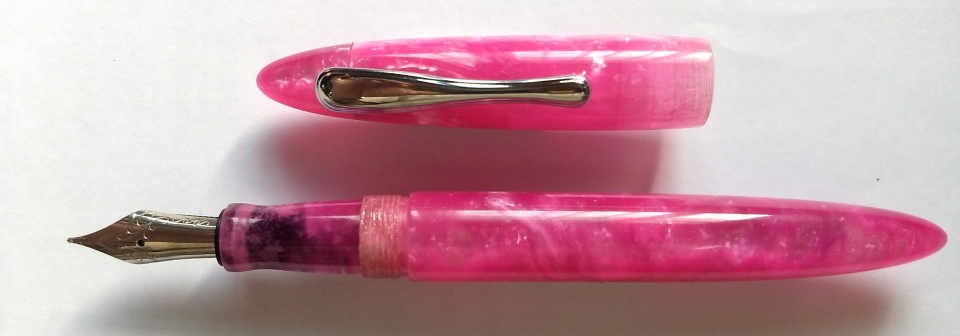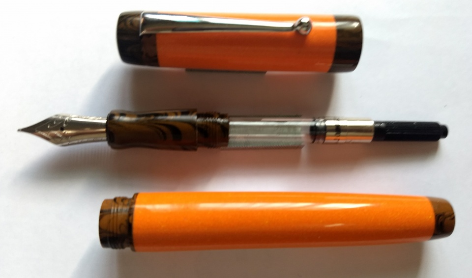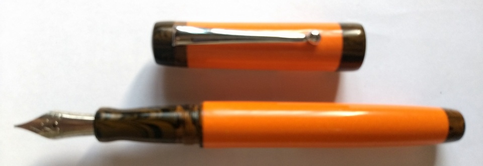 First set of pens made in 2018. The pink one is a purchased acrylic blank. The orange one is my own cast polyester resin material, with section and couplers made from ebonite. Jowo 6 nib unit and Schmidt k5 converter. Hope you like the design. Welcome comments and criticism.