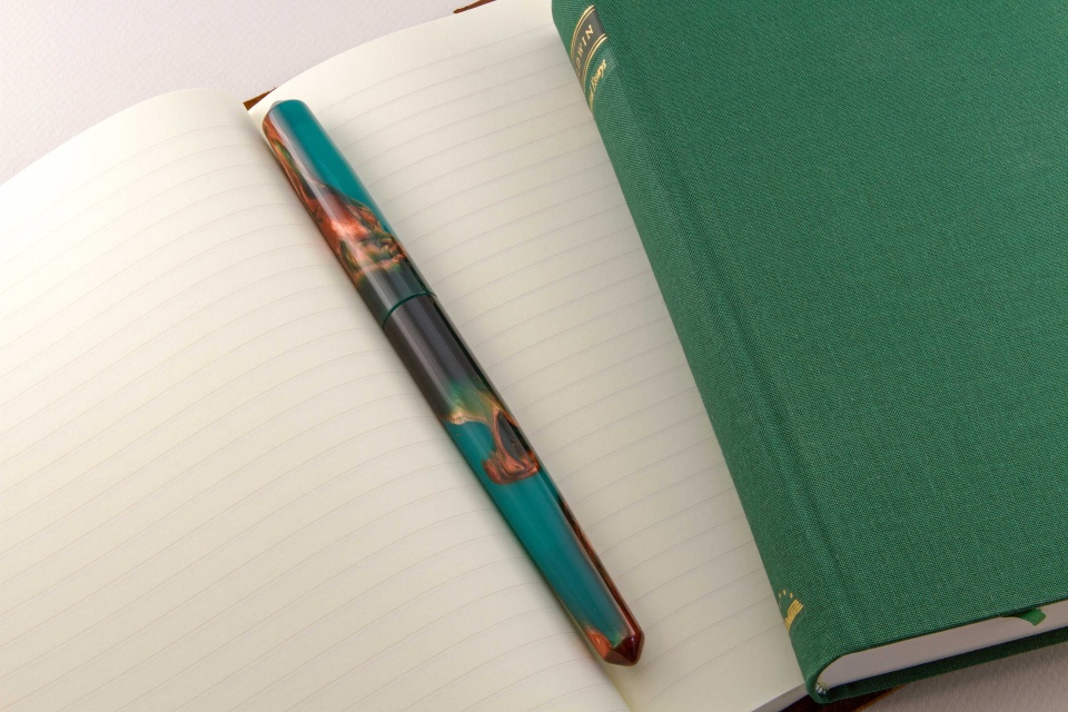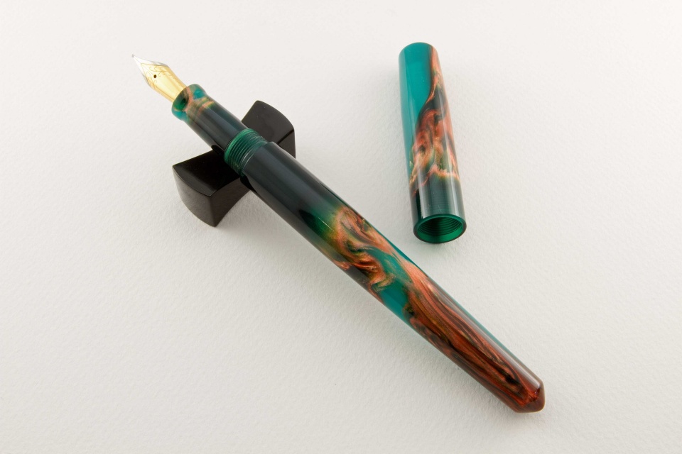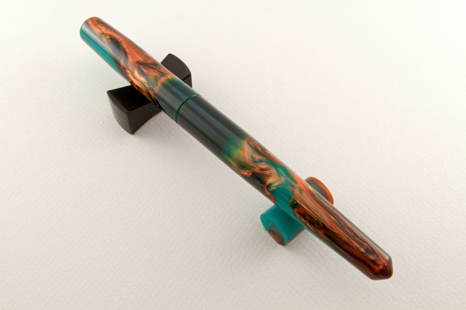 Alumilite provides a broad range of options you have in colors, colors you can "paint in" when you are making custom pens. I have worked closely with Bob Dupras to design custom alumilite blanks that provide color transitions to make them interesting. Greens and blues are my favorites, with a splash of precious metal color. I decided to showcase as much of the transition of two pen blanks as I could by making a desk pen for myself (the green pen); I also find the longer pens easier to write with. The blue fountain pen I made for my favorite Aunt, who is in her nineties and still writes. Hope you enjoy the colors (thanks Bob!).