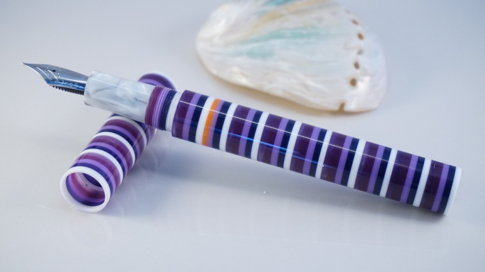 The second is Hoops and Loops Purple Paradise with the section done in White Pearl. The nib is a Jowo #6 Polished Steel.