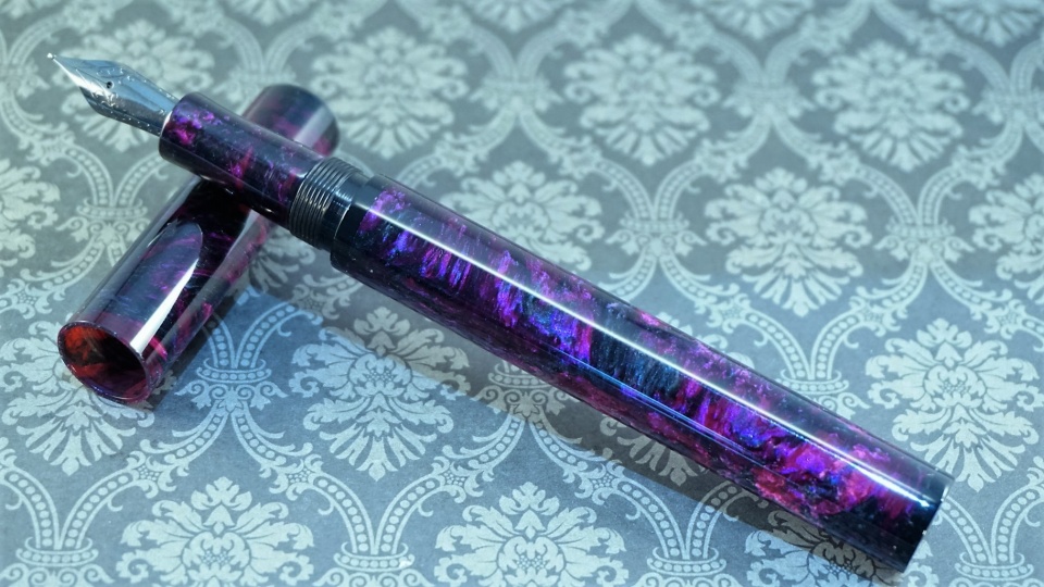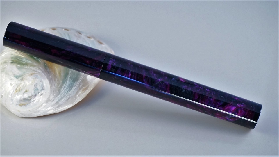 The first has the body and section done in Royal Society Purple with endcaps and male cap threads in Black AA. The nib is a Jowo #6 Black Oxide (this one was a little hard to photograph but the two shots show the difference between strong light and a more natural light).