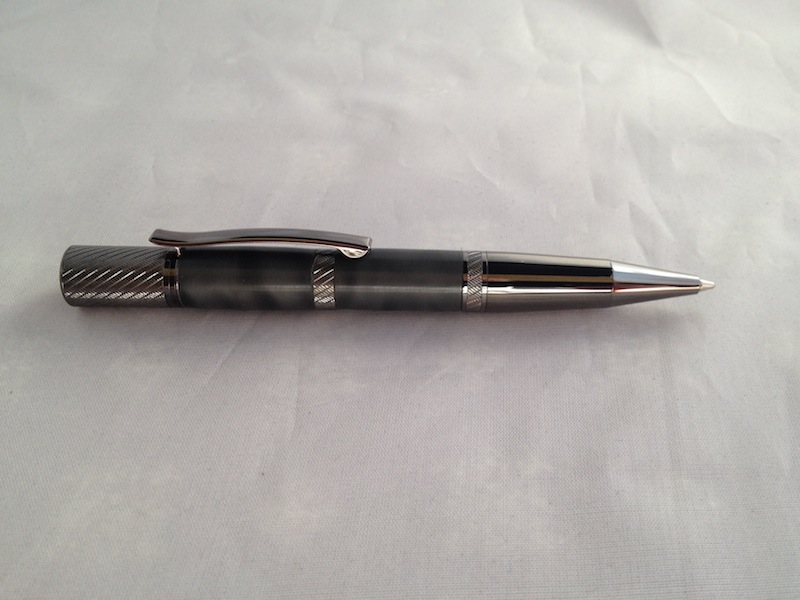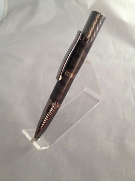 I also bought a few of the Pensar kits from Berea and instead of turning two different blanks, I used the same blank for both tubes. This material is called Nylatron - a nylon plastic used to cast plastic parts for machines and to make casters. It turns nicely as well, but be prepared to stop and clear the strands that come off. It is almost like rubber. The plating in this pen is Gun Metal and it goes well with the Nylatron. The Nylatron, when turned has blotches that resemble tiger stripes. It really looks good in person.