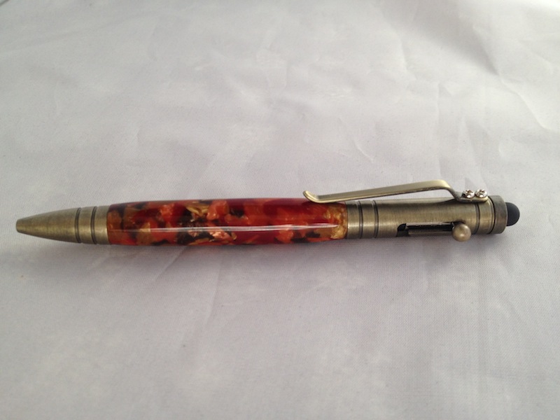 I bought some Mazzucchelli Cebloplast (Autumn) from Roy at Classic Nib a while ago. I decided to turn some of it and since I had one of the new PSI Tec Bolt Action, Antique Brass plated kits, I thought I would give it a try. The cebloplast turns like butter. Lovely stuff. The Tec Bolt Action kit is nice as well. One tip: when squaring the blank, use a pen mill. DO NOT use a sander -- DAMHIKT. (the stuff melts