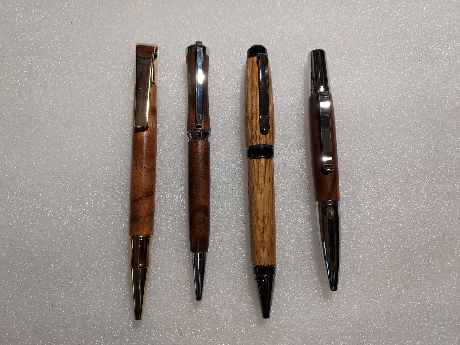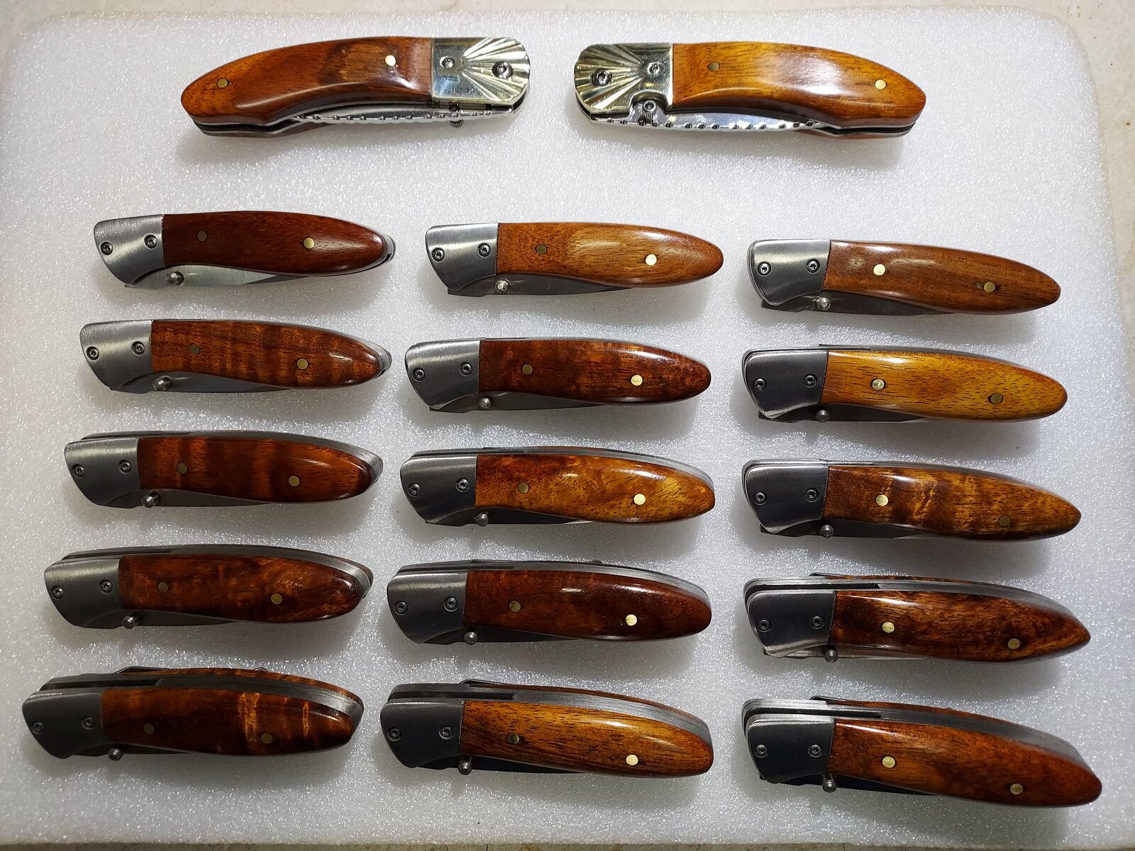 Here's the next installment of knives for a new customer. 18 more knives to go, and in the works, and this test will be completed. I also included some pens for their review, and hopefully an order, in the future. All the knives are in Koa and the pens Walnut, Monkey Pod Jack Daniels barrel stave. I've also included a couple of knives I just sent out for a customer in Alberta and California, both in Walnut.