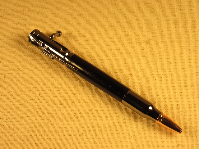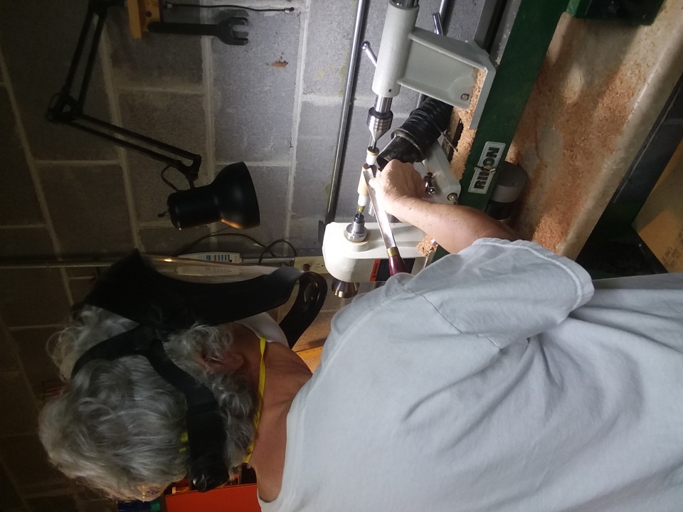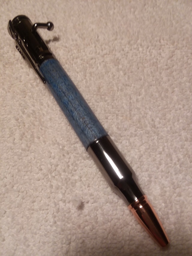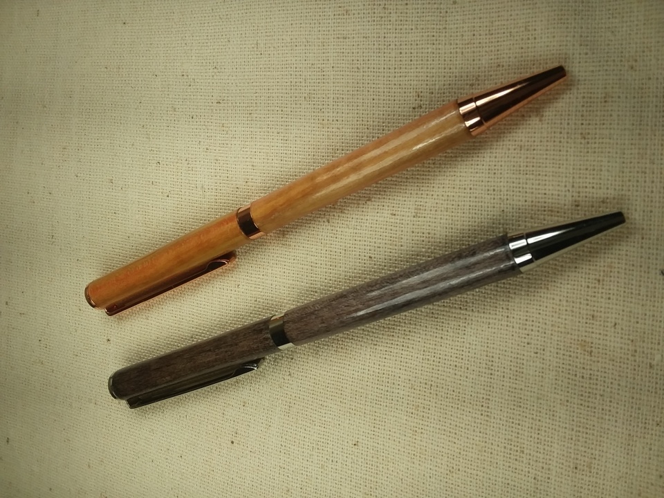 One pen is a satin finish with maple blank. It was finished with two coats of black Sharpie with each wiped down with acetone to even the color. The grain was a bit open so it had two coats of medium and six coats of thin CA. The other is a copper with flame box elder with CA finish,. Had a tiny open place in the grain and applied two coats of medium and six coats of thin CA. That one was made by my wife, her first pen and first turning. Both are Slimline from Woodcraft. Photos attached for you. OK, why are they turned 90 degrees? Wife looks like she is turning on the Equator.