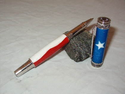 This is my version of a Texas Flag Pen. White star inlay in Texas Blue for the cap and wavy cut & lamination for the pen body on a Rhodium & Black Ti Jr. Majestic. Comments appreciated..... thanks for looking.:bye: