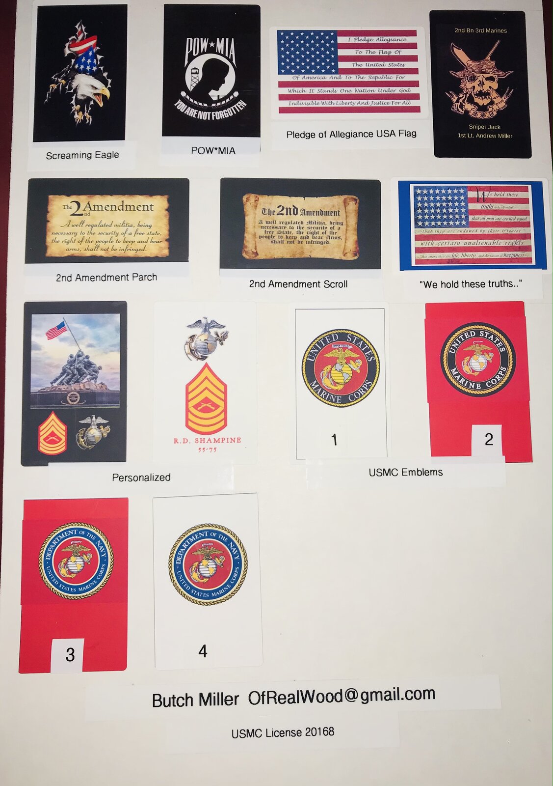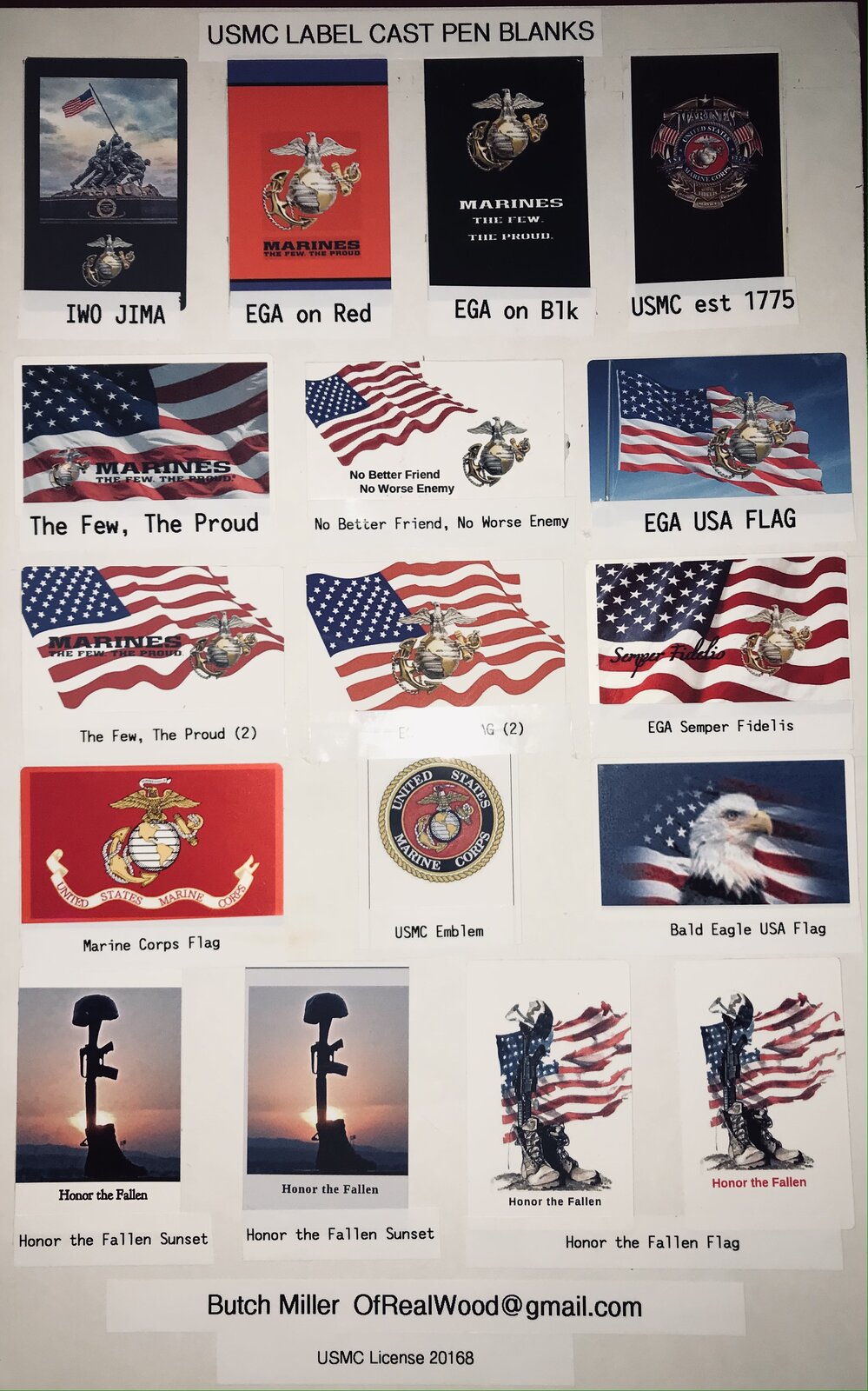 I cast and sell USMC themed label cast pen blanks. Primarily Sierra and .30cal sized tubes, others on request. Names and rank can be added to many designs, small custom design fee for names and rank. Regular price $10ea. Plus shipping. Alumilte Clear. Custom blanks upon request $12ea. PM or email me at Ofrealwood@gmail.comUSMC Hobbyists license #20168