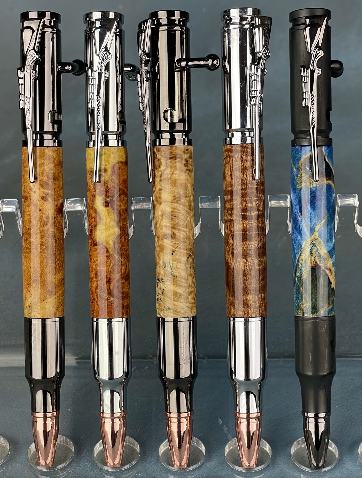 Woke up to snow with more on the way so I decided to get my work done early. Today's job: 5 ultra bolt pens. We use ultra when the wood is more expensive or the figure is amazing to me. Few customers shy away from the $15 premium, so it allows me to play with more pricey timbers.