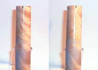 Anyway, I took the other one and did a quickie CA finish and polish to see if the effect remained. It did! I took 2 shot but turned the blank just slightly as you can see by the reference mark at the top. Most of the darker brown seems to disappear.