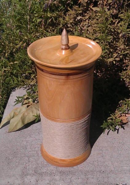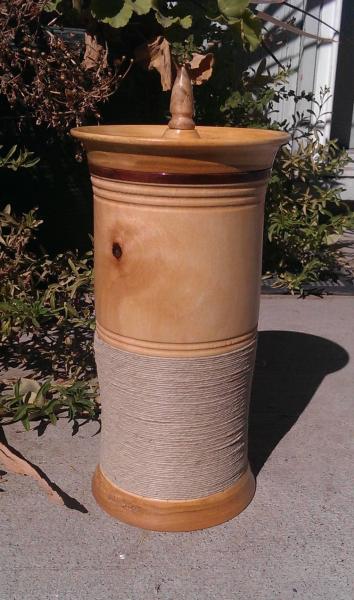 This was turned from a Sycamore log I saved from a tree we trimmed in the yard. Cherry Sap wood on the end caps. Cocobolo segmenting and a finial made from some burl I found in my tub of mystery wood scraps.