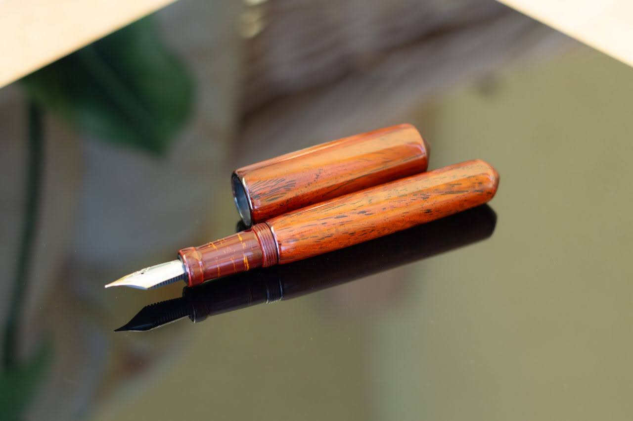 Amboyna wood with Urushi, Ebonite section with Urushi- sakurakawa nuri or cherry tree bark.